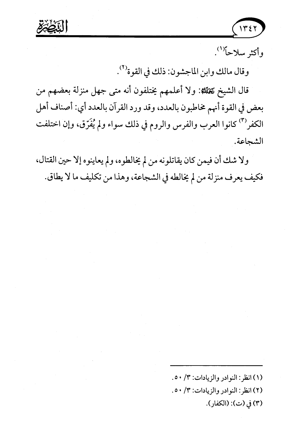 قال الشيخ -رحمه الله-: ولا أعلمهم يختلفون أنه متى جهل منزلة بعضهم من بعض في القوة أنهم مخاطبون بالعدد، وقد ورد القرآن بالعدد أي: أصناف أهل الكفر (¬3) كانوا العرب والفرس والروم في ذلك سواء ولم يُفَرّق، وإن اختلفت الشجاعة.