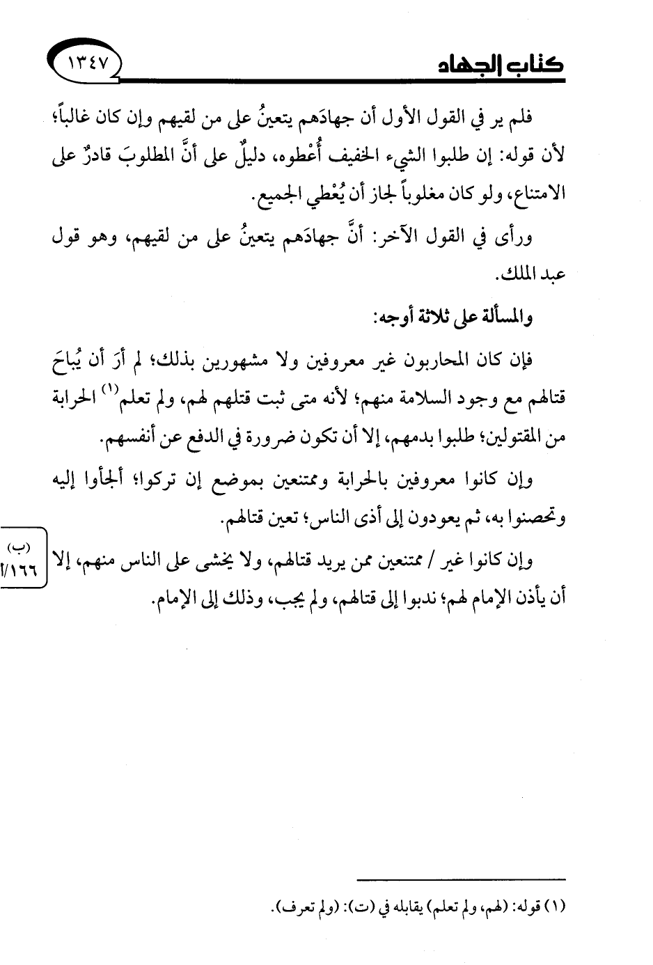 فلم ير في القول الأول أن جهادَهم يتعينُ على من لقيهم وإن كان غالبًا؛ لأن قوله: إن طلبوا الشيء الخفيف أُعْطوه، دليلٌ على أنَّ المطلوبَ قادرٌ على الامتناع، ولو كان مغلوبًا لجاز أن يُعْطي الجميع.