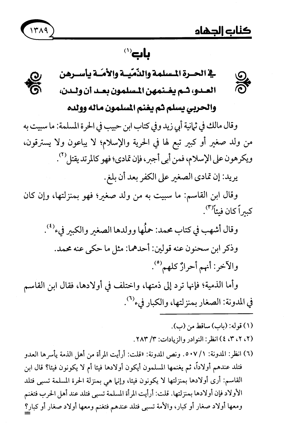 (¬6) انظر: المدونة: 1/ 507. ونص المدونة: "قلت: أرأيت المرأة من أهل الذمة يأسرها العدو فتلد عندهم أولادًا، ثم يغنمها المسلمون أيكون أولادها فيئا أم لا يكونون فيئا؟ قال ابن القاسم: أرى أولادها بمنزلتها لا يكونون فيئا، وإنا هي بمنزلة الحرة المسلمة تسبى فتلد الأولاد فإن أولادها بمنزلتها. قلت: أرأيت المرأة المسلمة تسبى فتلد عند أهل الحرب فتغنم ومعها أولاد صغار أو كبار، والأمة تسبى فتلد عندهم فتغنم ومعها أولاد صغار أو كبار؟ =