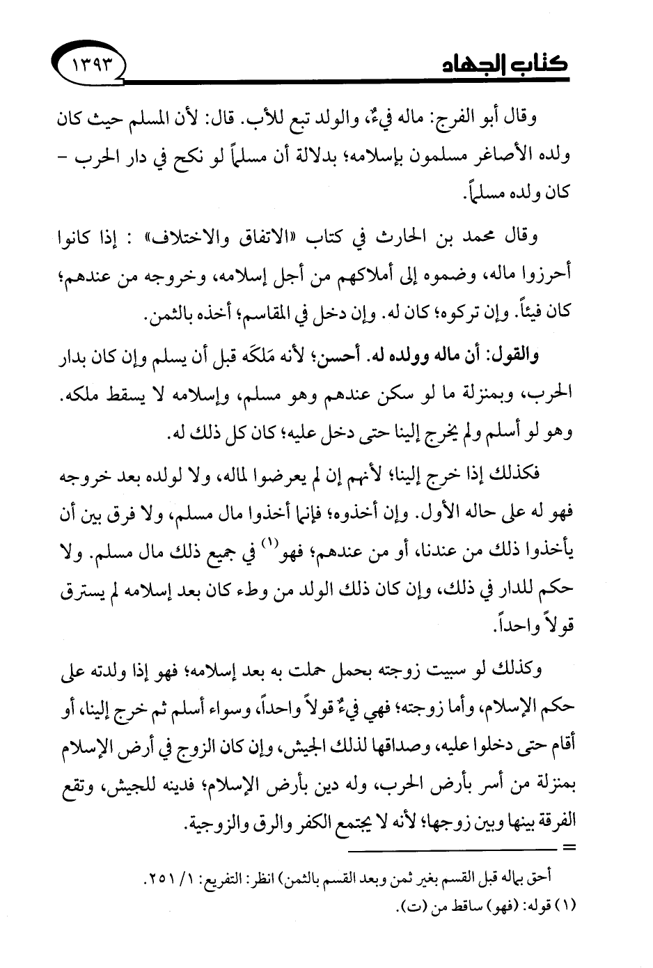 وقال أبو الفرج: ماله فيءٌ، والولد تبع للأب. قال: لأن المسلم حيث كان ولده الأصاغر مسلمون بإسلامه؛ بدلالة أن مسلمًا لو نكح في دار الحرب- كان ولده مسلمًا.
