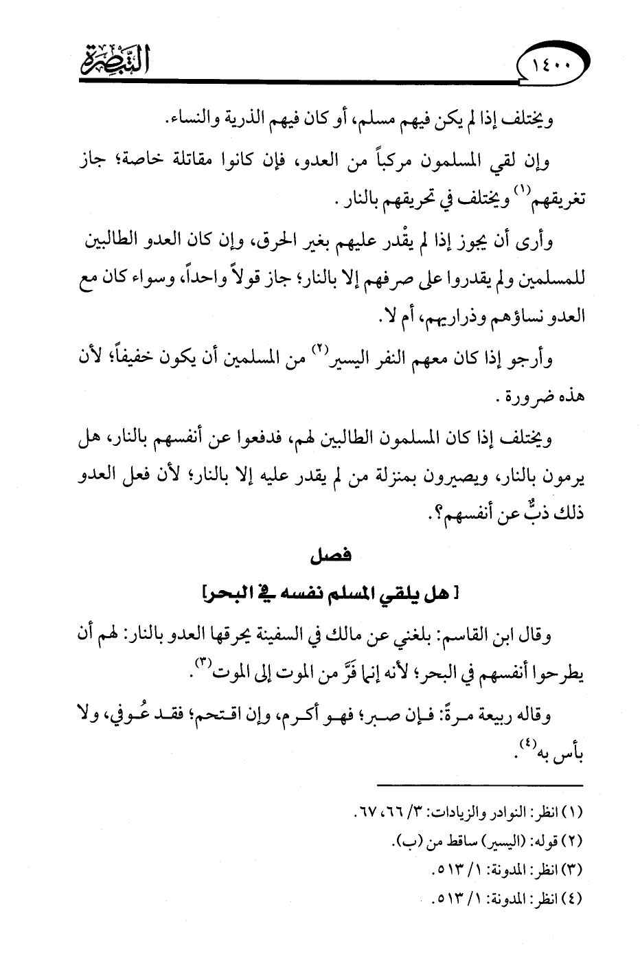 وقال ابن القاسم: بلغني عن مالك في السفينة يحرقها العدو بالنار: لهم أن يطرحوا أنفسهم في البحر؛ لأنه إنما فَرَّ من الموت إلى الموت (¬3).