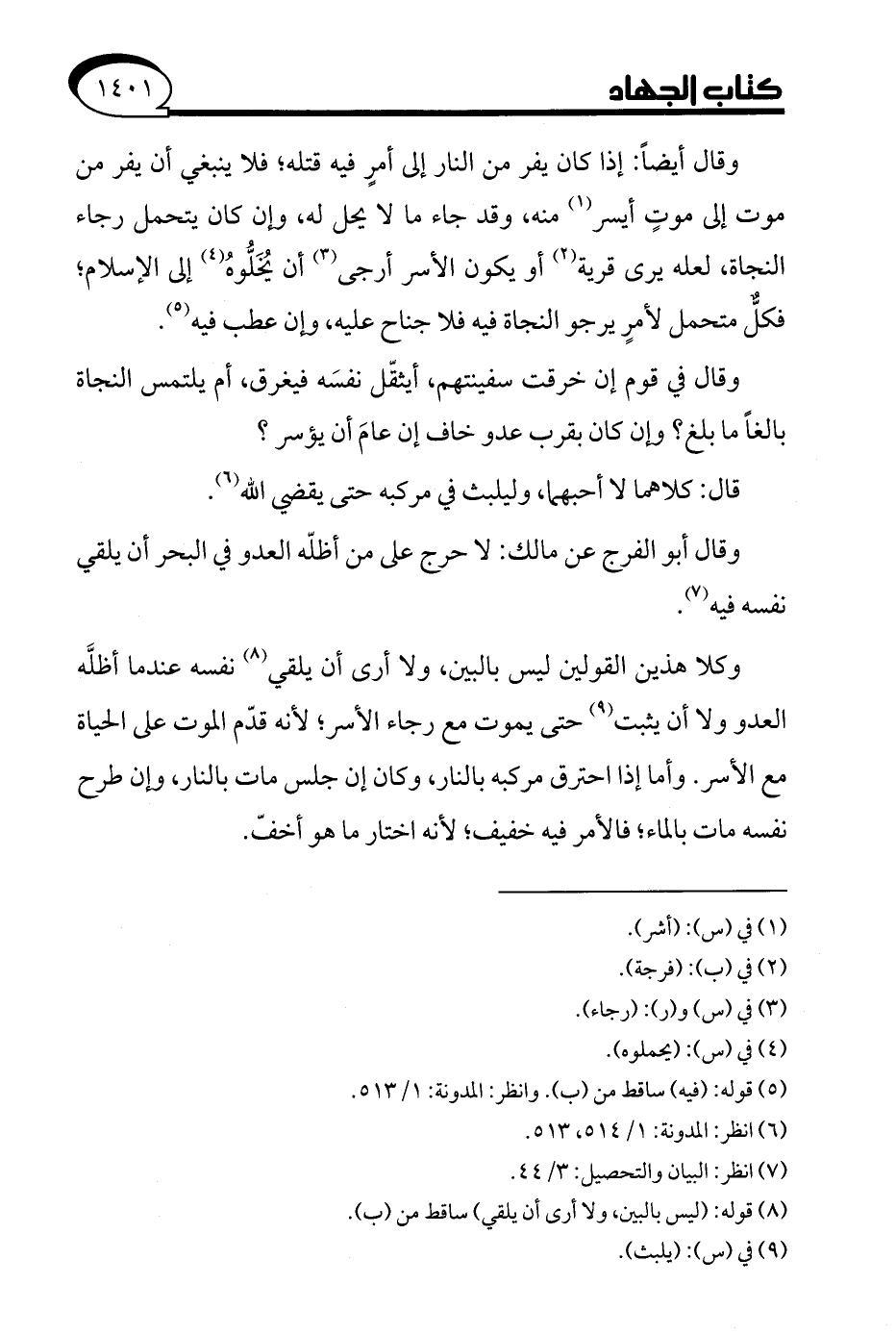 وكلا هذين القولين ليس بالبين، ولا أرى أن يلقي (¬8) نفسه عندما أظلَّه العدو ولا أن يثبت (¬9) حتى يموت مع رجاء الأسر؛ لأنه قدّم الموت على الحياة مع الأسر. وأما إذا احترق مركبه بالنار، وكان إن جلس مات بالنار، وإن طرح نفسه مات بالماء؛ فالأمر فيه خفيف؛ لأنه اختار ما هو أخفّ.