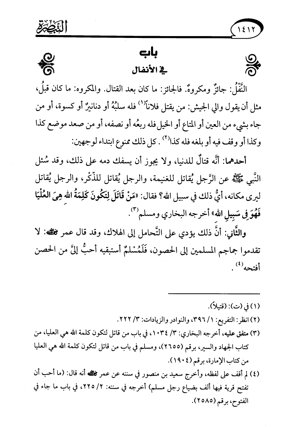 النَّفْلُ: جائزٌ ومكروهٌ. فالجائز: ما كان بعد القتال. والمكروه: ما كان قبلُ، مثل أن يقول والي الجيش: من يقتل فلانًا (¬1) فله سلبُهُ أو دنانيرٌ أو كسوة، أو من جاء بشيء من العين أو المتاع أو الخيل فله ربعُه أو نصفه، أو من صعد موضع كذا وكذا أو وقف فيه أو بلغه فله كذا (¬2). كل ذلك ممنوع ابتداء لوجهين: