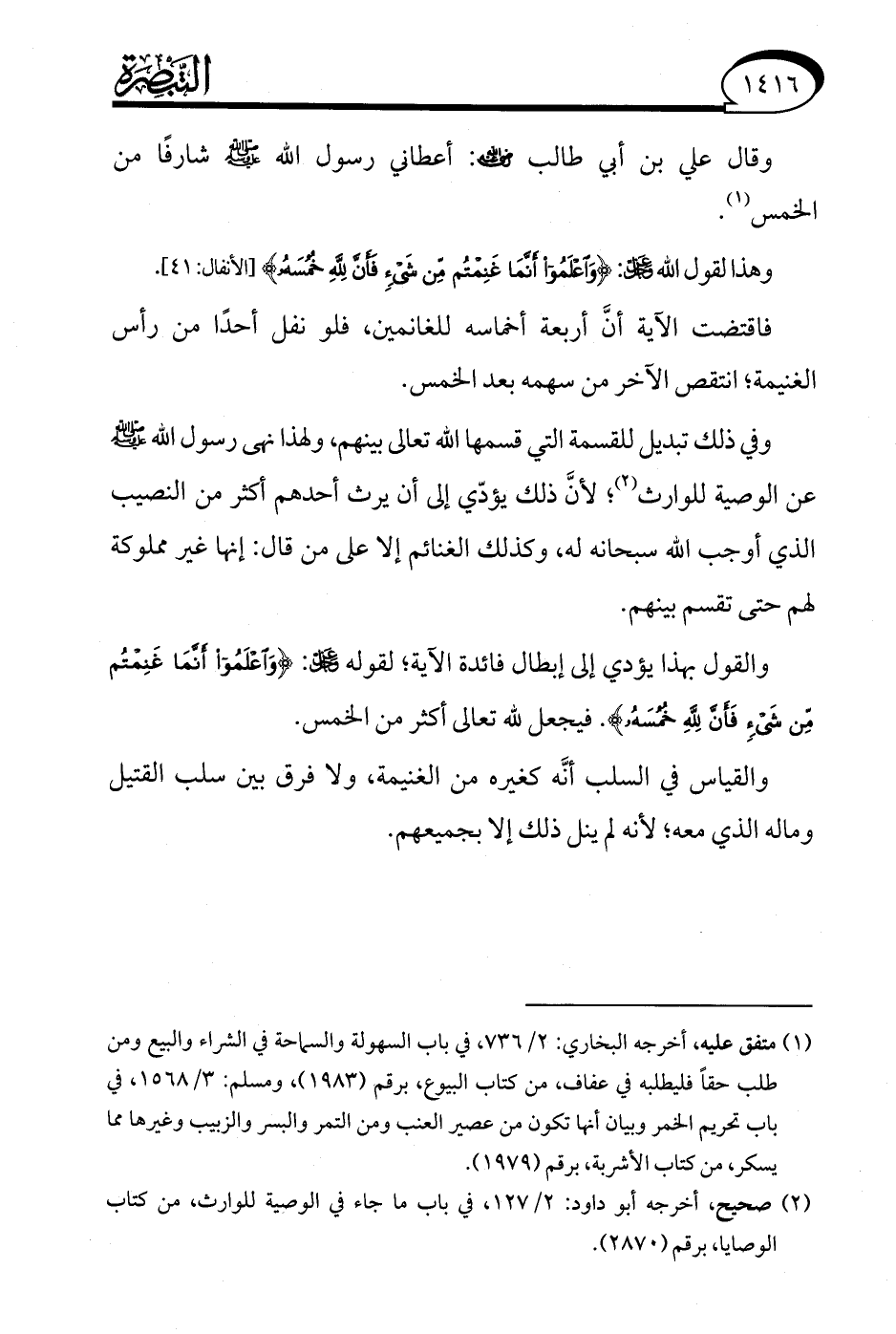 وفي ذلك تبديل للقسمة التي قسمها الله تعالى بينهم، ولهذا نهى رسول الله - صلى الله عليه وسلم - عن الوصية للوارث (¬2)؛ لأنَّ ذلك يؤدّي إلى أن يرث أحدهم أكثر من النصيب الذي أوجب الله سبحانه له، وكذلك الغنائم إلا على من قال: إنها غير مملوكة لهم حتى تقسم بينهم.