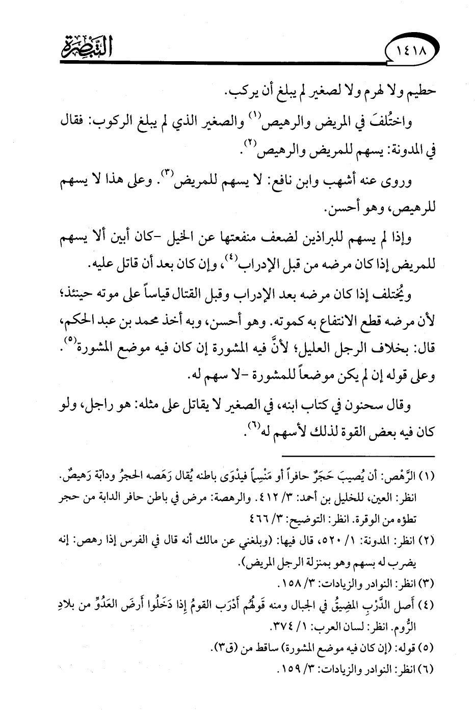 (¬2) انظر: المدونة: 1/ 520، قال فيها: (وبلغني عن مالك أنه قال في الفرس إذا رهص: إنه يضرب له بسهم وهو بمنزلة الرجل المريض).