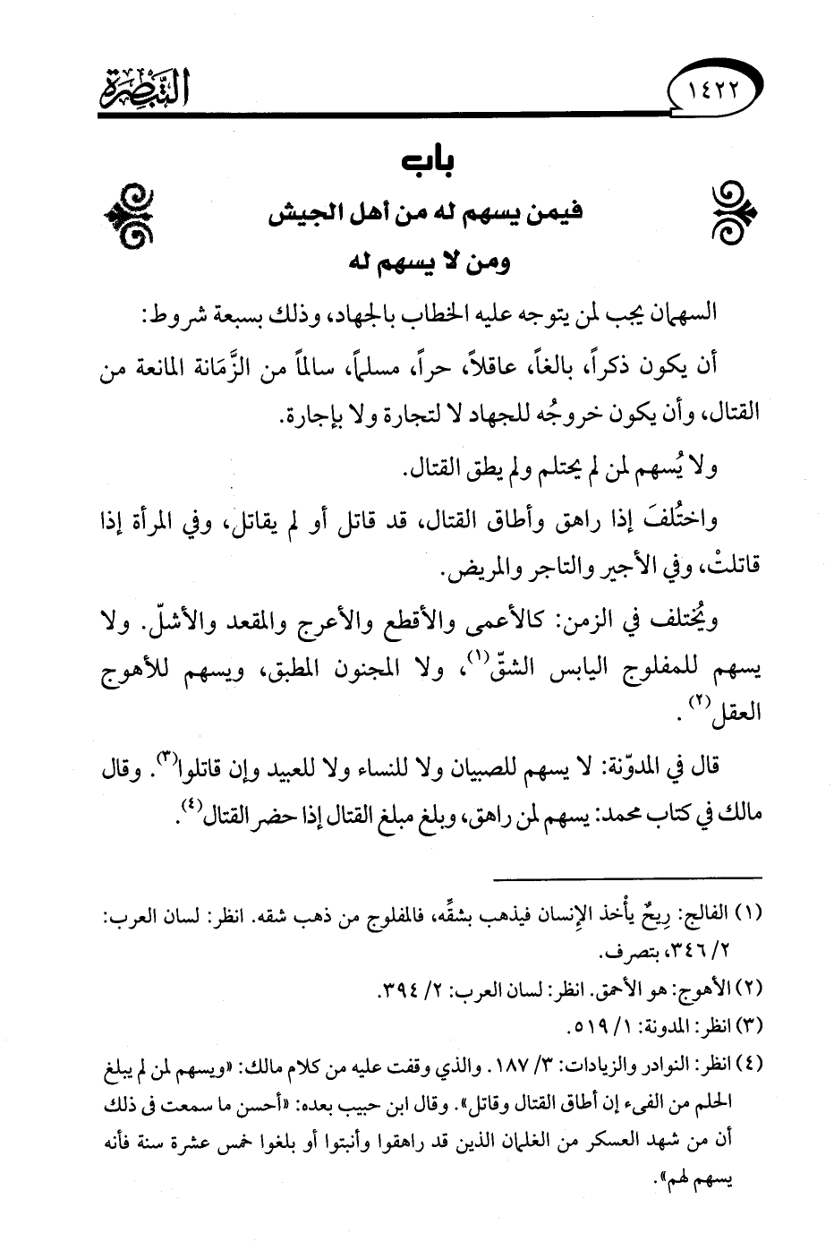 (¬4) انظر: النوادر والزيادات: 3/ 187. والذي وقفت عليه من كلام مالك: "ويسهم لمن لم يبلغ الحلم من الفىء إن أطاق القتال وقاتل". وقال ابن حبيب بعده: "أحسن ما سمعت في ذلك أن من شهد العسكر من الغلمان الذين قد راهقوا وأنبتوا أو بلغوا خمس عشرة سنة فأنه يسهم لهم".