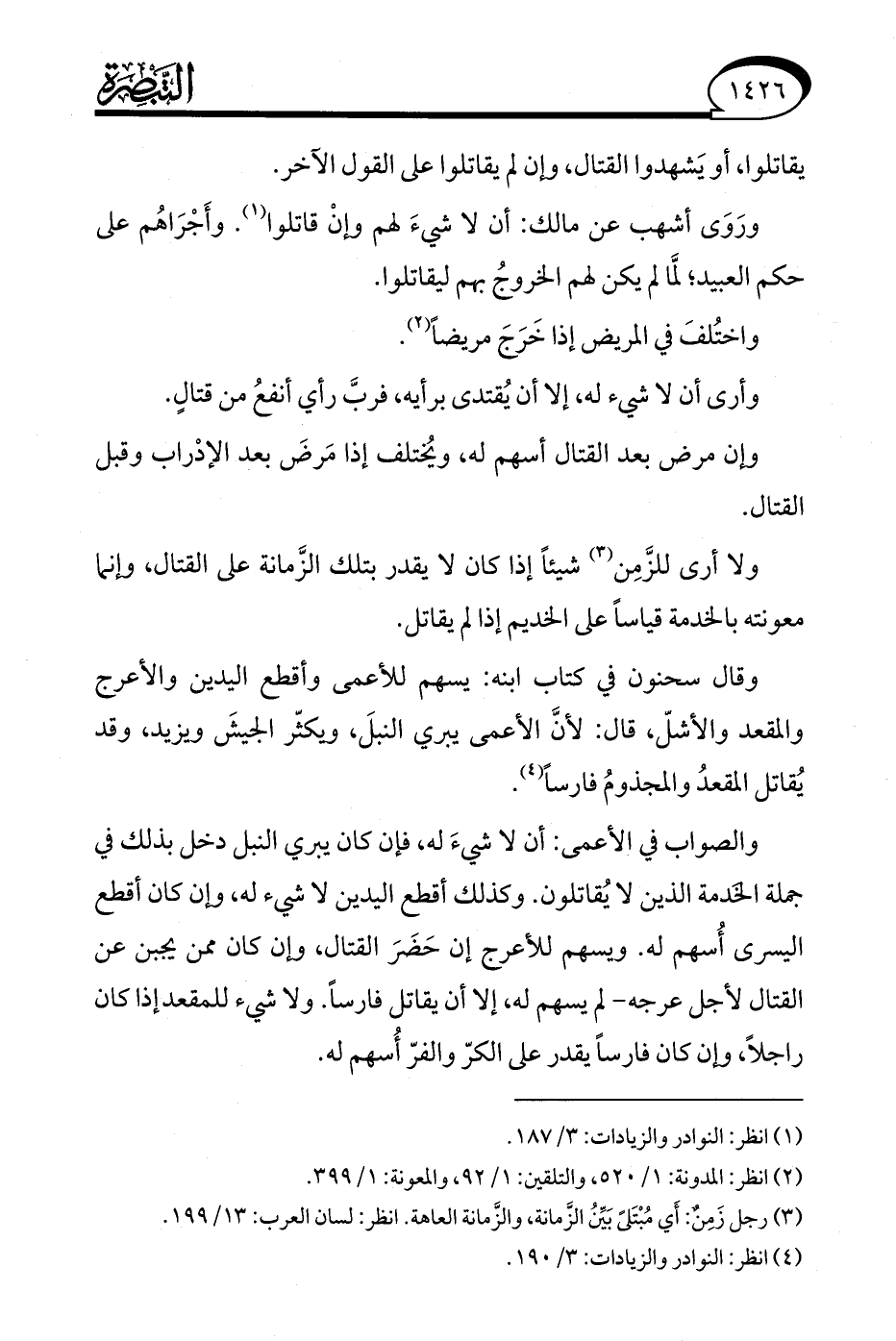 وقال سحنون في كتاب ابنه: يسهم للأعمى وأقطع اليدين والأعرج والمقعد والأشلّ، قال: لأنَّ الأعمى يبري النبلَ، ويكثّر الجيشَ ويزيد، وقد يُقاتل المقعدُ والمجذومُ فارسًا (¬4).