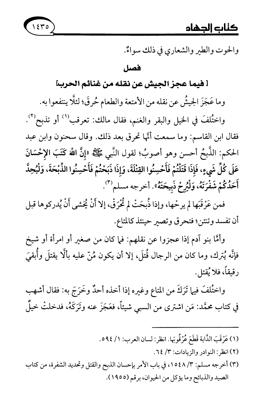 فقال ابن القاسم: وما سمعت أنَّها تحرق بعد ذلك. وقال سحنون وابن عبد الحكم: الذَّبحُ أحسن وهو أصوبُ؟ لقول النَّبي - صلى الله عليه وسلم - "إِنَّ اللهَ كتَبَ الإِحْسَانَ عَلَى كُلِّ شَيءٍ، فَإِذَا قَتَلْتُمْ فَأَحْسِنُوا القِتْلَةَ، وإذَا ذَبَحْتُمْ فَأَحْسِنُوا الذِّبْحَةَ, وَلْيُحِدَّ أَحَدُكمْ شَفْرَتَهُ , وَلْيرح ذَبِيحَتهُ". أخرجه مسلم (¬3).