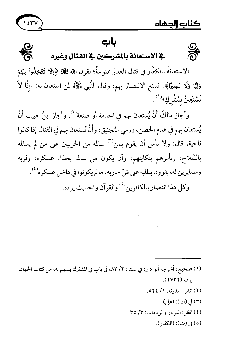 الاستعانةُ بالكفَّار في قتال العدوّ ممنوعةٌ؛ لقول الله -عز وجل- {وَلَا تَتَّخِذُوا مِنْهُمْ وَلِيًّا وَلَا نَصِيرًا (89)} [النساء: 89]. فمنع الانتصارَ بهم، وقال النَّبي - صلى الله عليه وسلم - لمن استعان به: "إِنَّا لاَ نَسْتَعِينُ بِمُشْرِكٍ " (¬1).