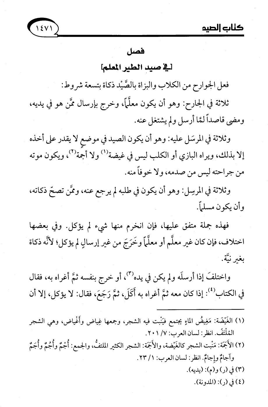 وثلاثة في المرسَل عليه: وهو أن يكون الصيد في موضعٍ لا يقدر على أخذه إلا بذلك، ويراه البازي أو الكلب ليس في غيضة (¬1) ولا أجمة (¬2)، ويكون موته من جراحته ليس من صدمه، ولا خوفًا منه.