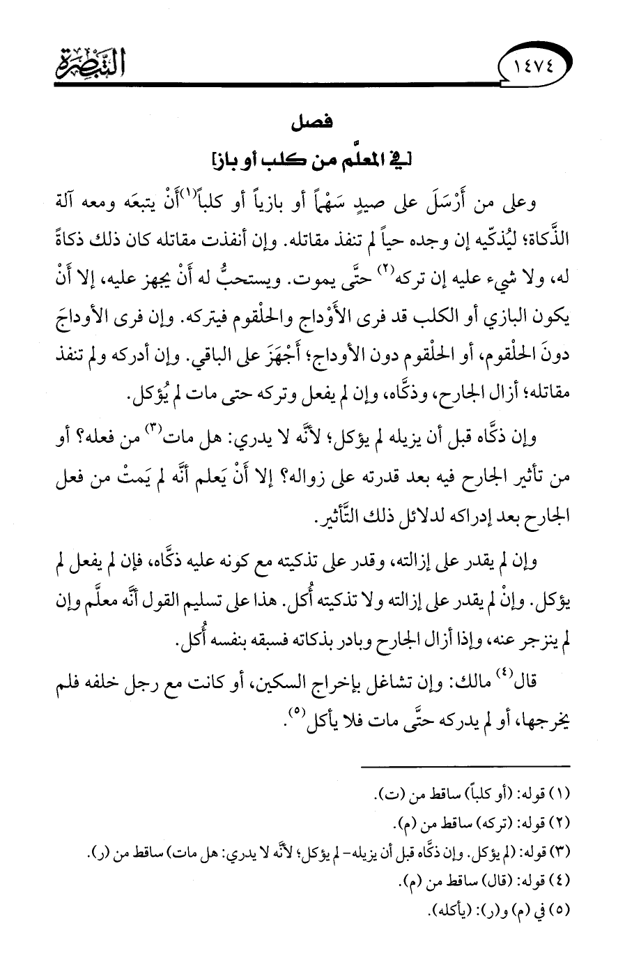 وعلى من أَرْسَلَ على صيدٍ سَهْمًا أو بازيًا أو كلبًا (¬1) أَنْ يتبعَه ومعه آلة الذَّكاة؛ ليُذكّيه إن وجده حيًا لم تنفذ مقاتله. وإن أنفذت مقاتله كان ذلك ذكاةً له، ولا شئ عليه إن تركه (¬2) حتَّى يموت. ويستحبُّ له أَنْ يجهز عليه، إلا أَنْ يكون البازي أو الكلب قد فرى الأَوْداج والحلْقوم فيتركه. وإن فرى الأوداجَ دونَ الحلْقوم، أو الحلْقوم دون الأوداج؛ أَجْهَزَ على الباقي. وإن أدركه ولم تنفذ مقاتله؛ أزال الجارح، وذكَّاه، وإن لم يفعل وتركه حتى مات لم يُؤكل.