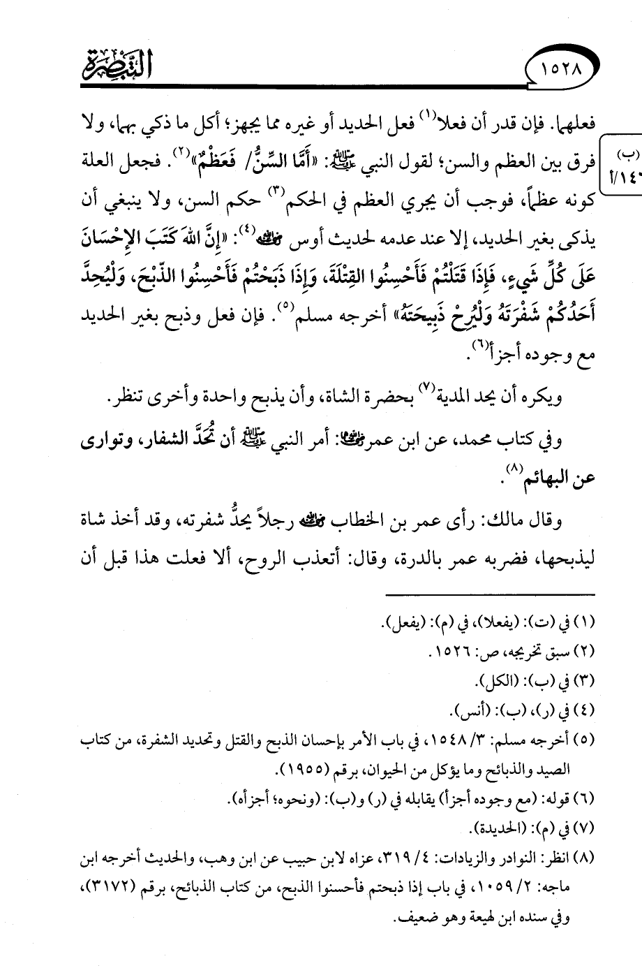 (¬8) انظر: النوادر والزيادات: 4/ 319، عزاه لابن حبيب عن ابن وهب، والحديث أخرجه ابن ماجه: 2/ 1059، في باب إذا ذبحتم فأحسنوا الذبح، من كتاب الذبائح، برقم (3172)، وفي سنده ابن لهيعة وهو ضعيف.