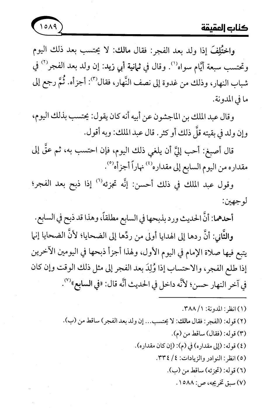 واختُلِفَ إذا ولد بعد الفجر: فقال مالك: لا يحتسب بعد ذلك اليوم وتحتسب سبعة أيَّام سواه (¬1). وقال في ثمانية أبي زيد: إن ولد بعد الفجر (¬2) في شباب النهار، وذلك من غدوة إلى نصف النَّهار، فقال (¬3): أجزأه. ثُمَّ رجع إلى ما في المدونة.