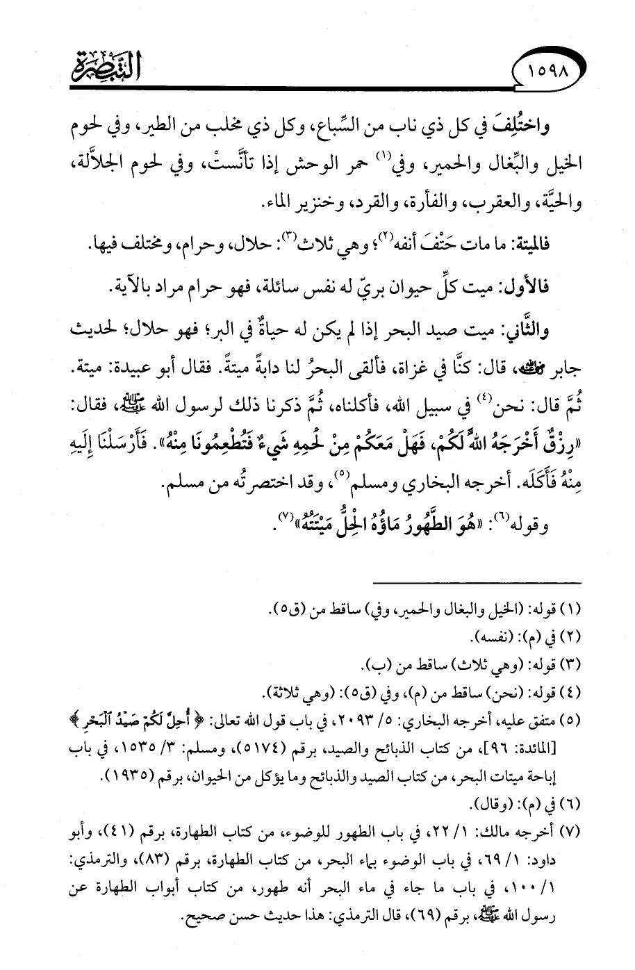 (¬7) أخرجه مالك: 1/ 22، في باب الطهور للوضوء، من كتاب الطهارة، برقم (41)، وأبو داود: 1/ 69، في باب الوضوء بماء البحر، من كتاب الطهارة، برقم (83)، والترمذي: 1/ 100، في باب ما جاء في ماء البحر أنه طهور، من كتاب أبواب الطهارة عن رسول الله - صلى الله عليه وسلم - برقم (69)، قال الترمذي: هذا حديث حسن صحيح.