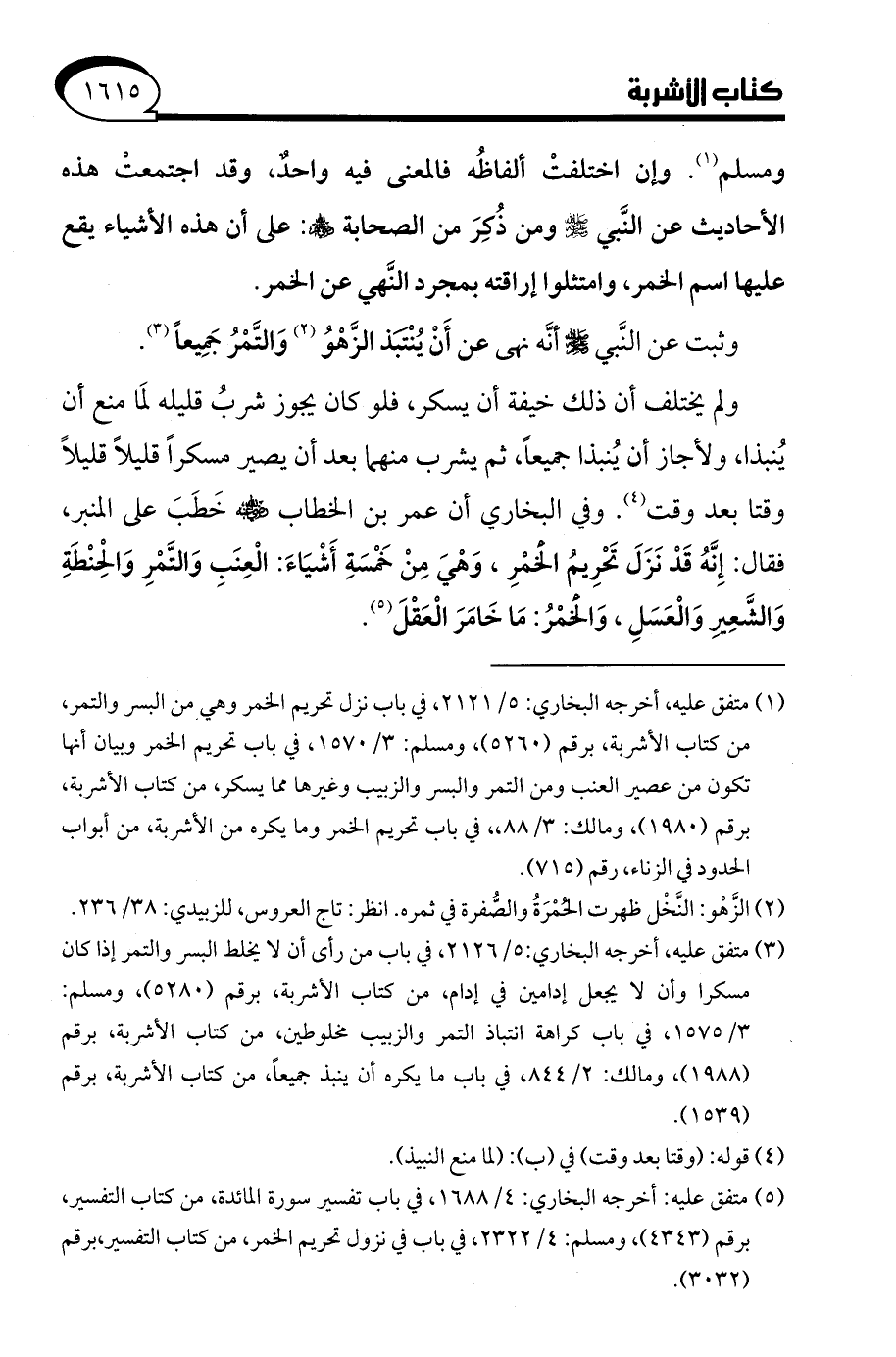 (¬1) متفق عليه، أخرجه البخاري: 5/ 2121، في باب نزل تحريم الخمر وهي من البسر والتمر، من كتاب الأشربة، برقم (5260)، ومسلم: 3/ 1570، في باب تحريم الخمر وبيان أنها تكون من عصير العنب ومن التمر والبسر والزبيب وغيرها مما يسكر، من كتاب الأشربة برقم (1980)، ومالك: 3/ 88،، في باب تحريم الخمر وما يكره من الأشربة، من أبواب الحدود في الزناء، رقم (715).