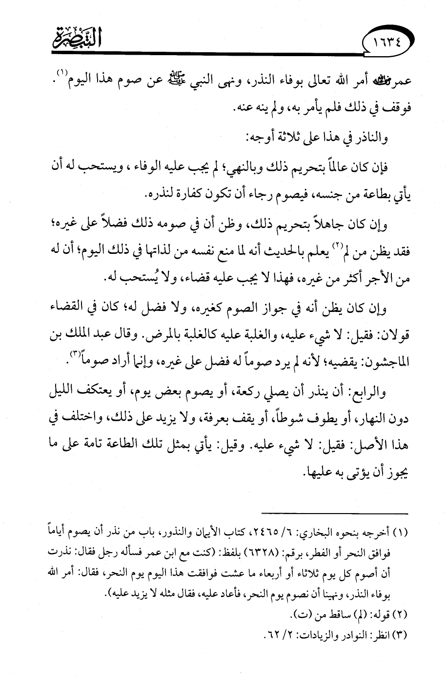 عمر - رضي الله عنه - أمر الله تعالى بوفاء النذر، ونهى النبي - صلى الله عليه وسلم - عن صوم هذا اليوم (¬1).