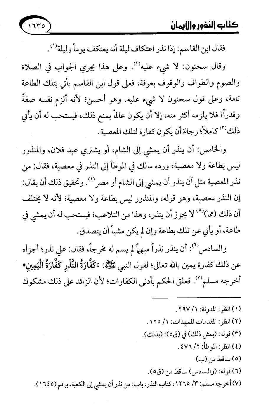 والخامس: أن ينذر أن يمشي إلى الشام، أو يشتري عبد فلان، والمنذور ليس بطاعة ولا معصية، ورده مالك في الموطأ إلى النذر في معصية، فقال: من نذر المعصية مثل أن ينذر أن يمشي إلى الشام أو مصر (¬4). وتحقيق ذلك أن يقال: إن النذر معصية، وهو قوله، والمنذور ليس بطاعة ولا معصية؛ لأنه لا يختلف أن ذلك (مما) (¬5) لا يجوز أن ينذر، وهذا من التلاعب؛ فيستحب له أن يمشي في طاعة، أو يأتي عن تلك بطاعة وإن لم يكن مشيًا أن يتصدق.
