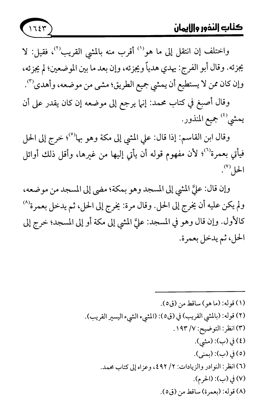 وإن قال: عليَّ المشي إلى المسجد وهو بمكة؛ مضى إلى المسجد من موضعه، ولم يكن عليه أن يخرج إلى الحل. وقال مرة: يخرج إلى الحل، ثم يدخل بعمرة (¬8) كالأول. وإن قال وهو في المسجد: عليَّ المشي إلى مكة أو إلى المسجد؛ خرج إلى الحل، ثم يدخل بعمرة.