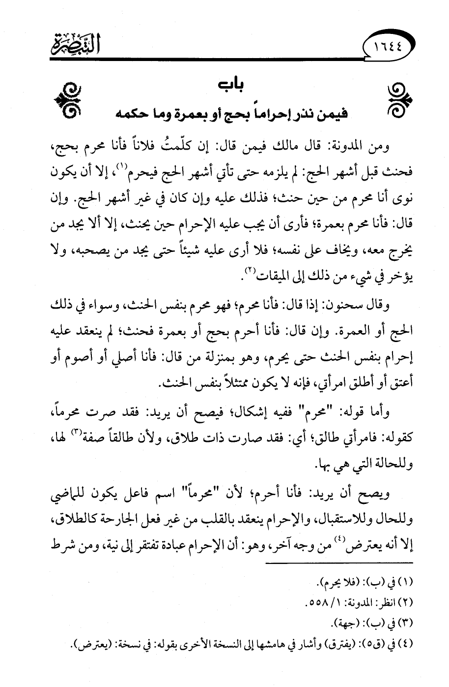 وقال سحنون: إذا قال؛ فأنا محرم؛ فهو محرم بنفس الحنث، وسواء في ذلك الحج أو العمرة. وإن قال: فأنا أحرم بحج أو بعمرة فحنث؛ لم ينعقد عليه إحرام بنفس الحنث حتى يحرم، وهو بمنزلة من قال: فأنا أصلي أو أصوم أو أعتق أو أطلق امرأتي، فإنه لا يكون ممتثلًا بنفس الحنث.