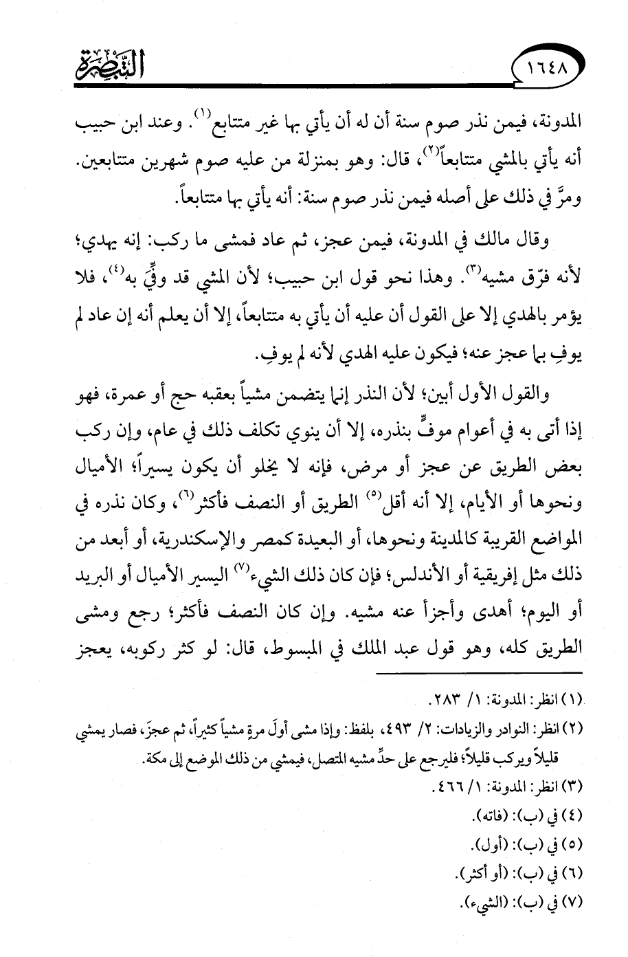(¬2) انظر: النوادر والزيادات: 2/ 493، بلفظ: وإذا مشى أولَ مرةٍ مشيًا كثيرًا، ثم عجزَ، فصار يمشي قليلًا ويركب قليلًا؛ فليرجع على حدِّ مشيه المتصل، فيمشي من ذلك الموضع قال مكة.