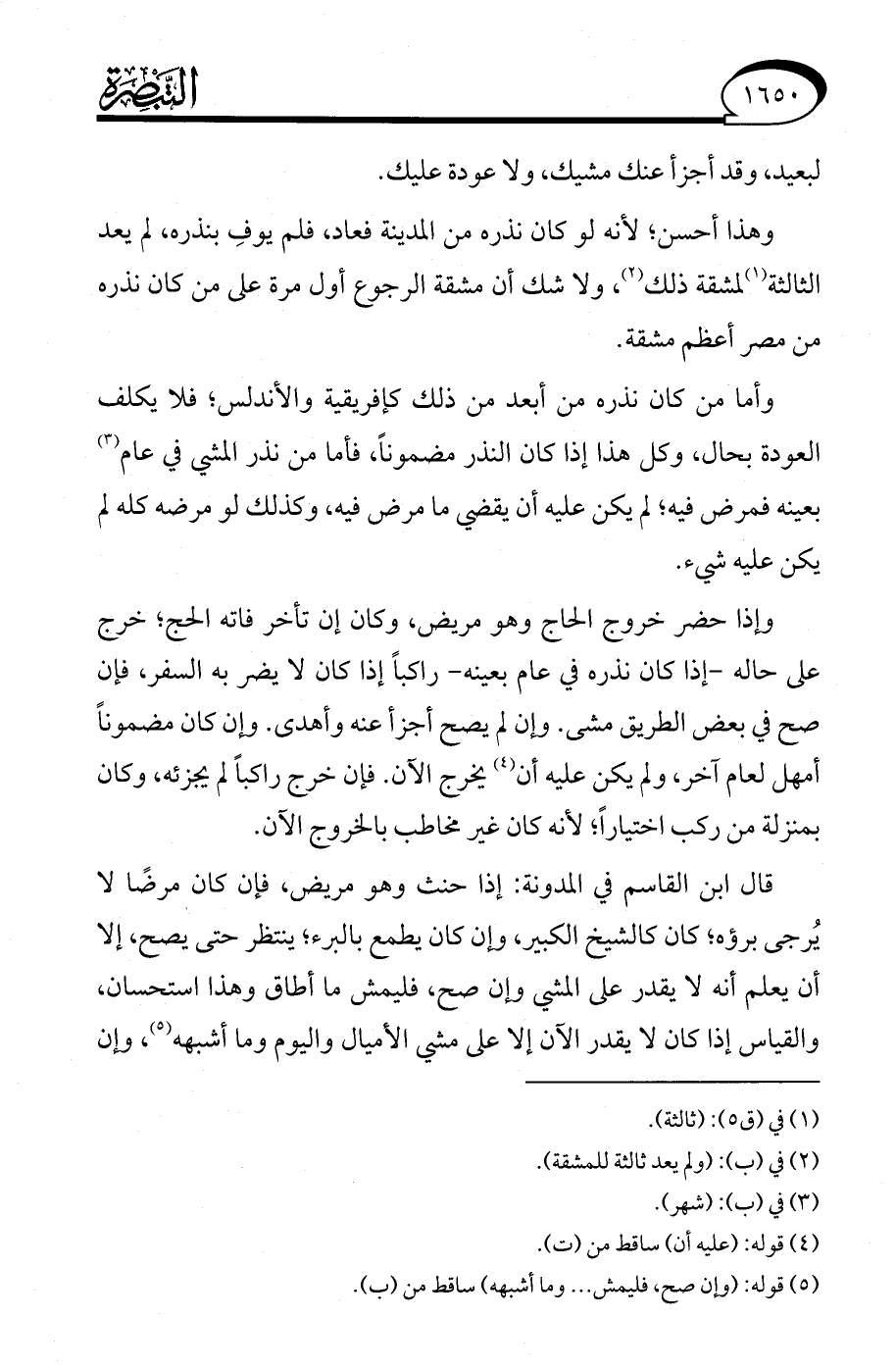 وأما من كان نذره من أبعد من ذلك كإفريقية والأندلس؛ فلا يكلف العودة بحال، وكل هذا إذا كان النذر مضمونًا، فأما من نذر المشي في عام (¬3) بعينه فمرض فيه؛ لم يكن عليه أن يقضي ما مرض فيه، وكذلك لو مرضه كله لم يكن عليه شيء.