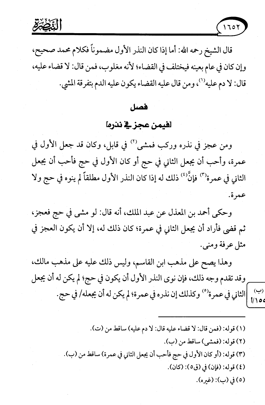 قال الشيخ رحمه الله: أما إذا كان النذر الأول مضمونًا فكلام محمد صحيح، وإن كان في عام بعينه فيختلف في القضاء؛ لأنه مغلوب، فمن قال: لا قضاء عليه، قال: لا دم عليه (¬1)، ومن قال عليه القضاء يكون عليه الدم بتفرقة المشي.