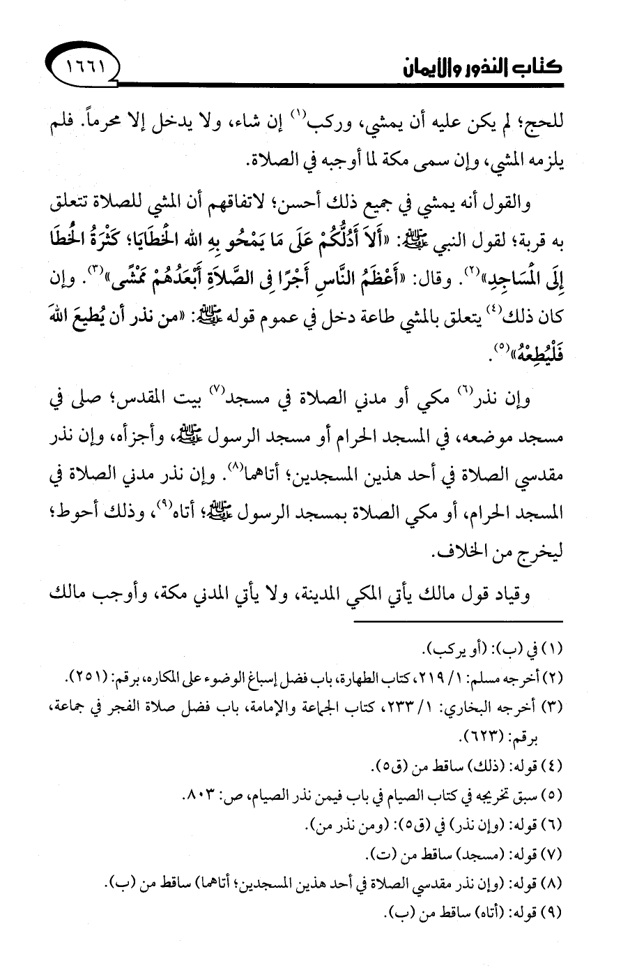 والقول أنه يمشي في جميع ذلك أحسن؛ لاتفاقهم أن المشي للصلاة تتعلق به قربة؛ لقول النبي - صلى الله عليه وسلم -: "أَلاَ أَدُلُّكُمْ عَلَى مَا يَمْحُو بِهِ الله الخَطَايَا؛ كَثْرَةُ الخُطَا إِلَى المَسَاجِدِ" (¬2). وقال: "أَعْظَمُ النَّاسِ أَجْرًا فِى الصَّلاَةِ أَبْعَدُهُمْ مَمْشىً" (¬3). وإن كان ذلك (¬4) يتعلق بالمشي طاعة دخل في عموم قوله - صلى الله عليه وسلم -: "من نذر أن يُطيعَ اللهَ فَلْيُطِعْهُ" (¬5).