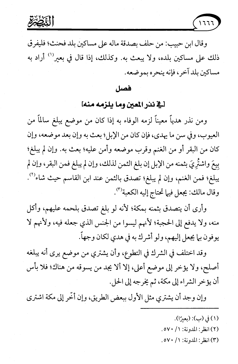 ومن نذر هديًا معينًا لزمه الوفاء به إذا كان من موضع يبلغ سالمًا من العيوب، وفي سن ما يهدى، فإن كان من الإبل؛ بعث به وإن بعد موضعه، وإن كان من البقر أو من الغنم وقرب موضعه وأمن عليه؛ بعث به. وإن لم يبلغ؛ بِيعَ واشتُرِيَ بثمنه من الإبل إن بلغ الثمن لذلك، وإن لم يبلغ فمن البقر، وإن لم يبلغ، فمن الغنم، وإن لم يبلغ؛ تصدق بالثمن عند ابن القاسم حيث شاء (¬2). وقال مالك: يجعل فيما تحتاج إليه الكعبة (¬3).