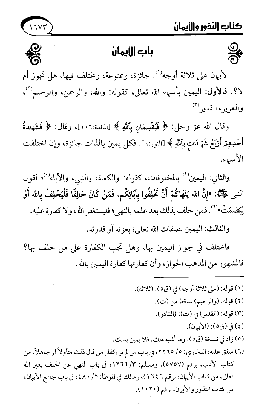 الأيمان على ثلاثة أوجه (¬1): جائزة، وممنوعة، ومختلف فيها، هل تجوز أم لا؟. فالأول: اليمين بأسماء الله تعالى، كقوله: والله، والرحمن، والرحيم (¬2)، والعزيز، القدير (¬3).