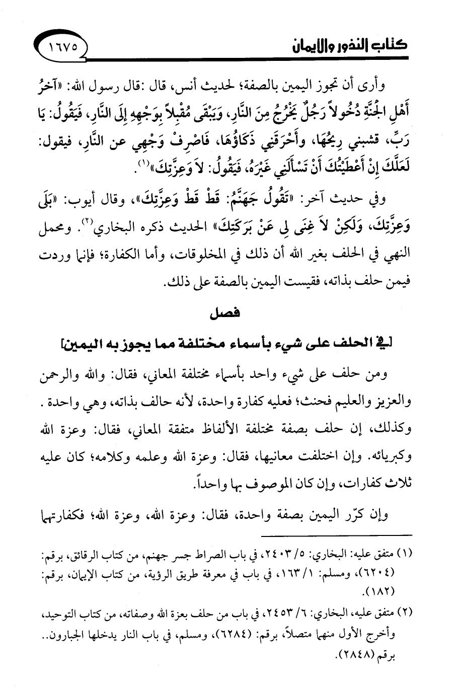 وأرى أن تجوز اليمين بالصفة؛ لحديث أنس، قال: قال رسول الله: "آخرُ أَهْلِ الجنَّةِ دُخُولًا رَجُلٌ يَخْرُجُ مِنَ النَّارِ، وَيَبْقَى مُقْبِلًا بِوَجْهِهِ إِلَى النَّارِ، فَيَقُولُ: يَا رَبِّ، قشبني رِيحُهَا، وأَحْرَقَنِي ذَكَاؤُهَا، فَاصْرِفْ وَجْهِي عن النَّارِ، فيقول: لَعَلَّكَ إِنْ أَعْطَيْتُكَ أَنْ تَسْأَلَنِي غَيْرَهُ، فَيَقُولُ: لاَ وَعِزَّتِكَ" (¬1).