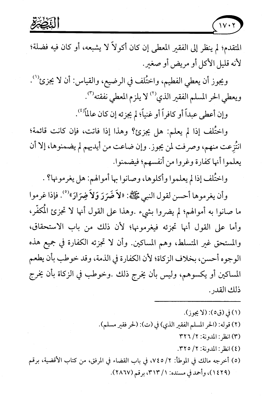 وأن يغرموها أحسن لقول النبي - صلى الله عليه وسلم -: "لاَ ضَرَرَ وَلاَ ضِرَارَ" (¬5). فإذا غرموا ما صانوا به أموالهم؛ لم يضروا بشيء. وهذا على القول أنها لا تجزئ المُكفّر، وأما على القول أنها تجزئه فيغرمونها؛ لأن ذلك من باب الاستحقاق، والمستحق غير المتسلط، وهم المساكين. وأن لا تجزئه الكفارة في جميع هذه الوجوه أحسن، بخلاف الزكاة؛ لأن الكفارة في الذمة، وقد خوطب بأن يطعم المساكين أو يكسوهم، وليس بأن يخرج ذلك. وخوطب في الزكاة بأن يخرج ذلك القدر.