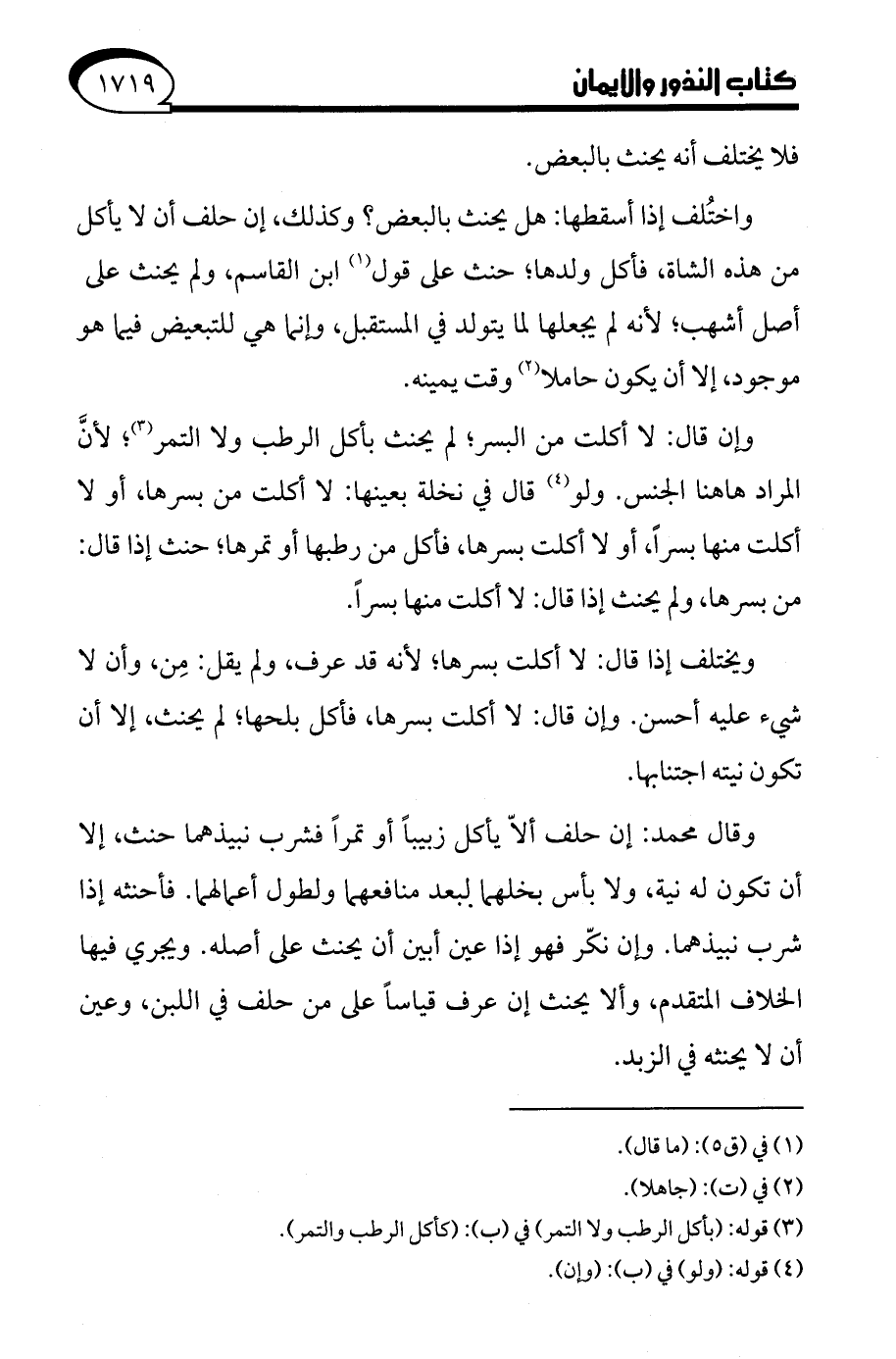 وقال محمد: إن حلف ألاّ يأكل زبيبًا أو تمرًا فشرب نبيذهما حنث، إلا أن تكون له نية، ولا بأس بخلهما ببعد منافعهما ولطول أعمالهما. فأحنثه إذا شرب نبيذهما. وإن نكّر فهو إذا عين أبن أن يحنث على أصله. ويجري فيها الخلاف المتقدم، وألا يحنث إن عرف قياسًا على من حلف في اللبن، وعن أن لا يحنثه في الزبد.
