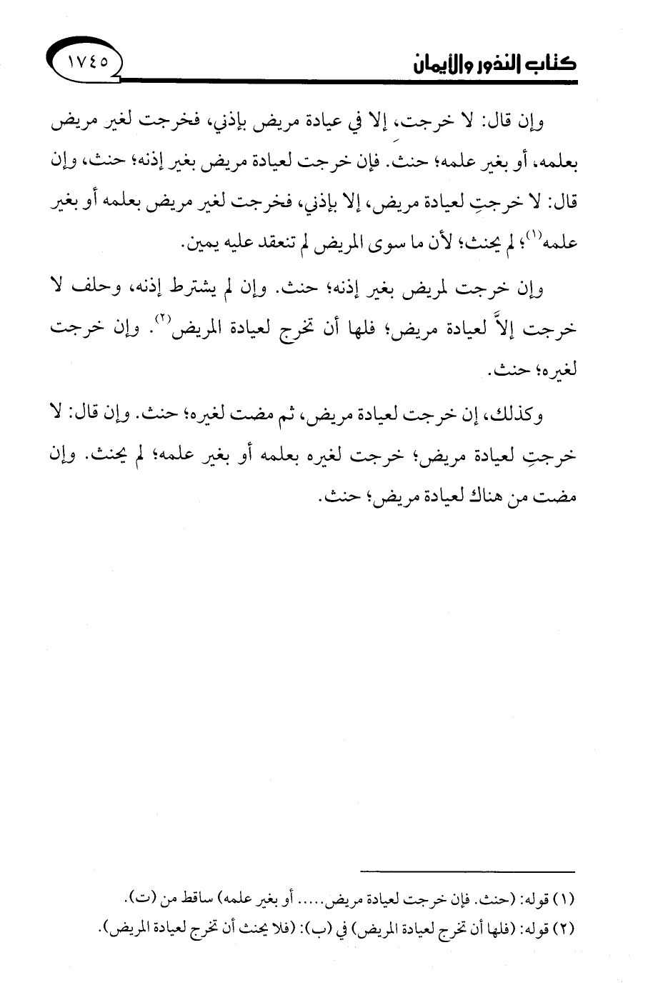 (¬2) قوله: (فلها أن تخرج لعيادة المريض) في (ب): (فلا يحنث أن تخرج لعيادة المريض).