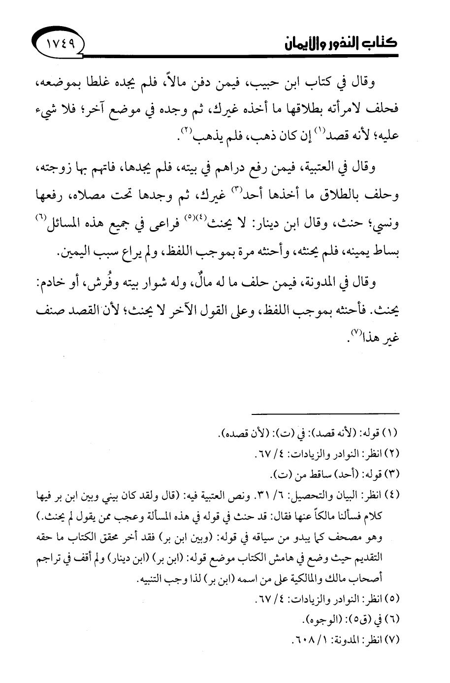 (¬4) انظر: البيان والتحصيل: 6/ 31. ونص العتبية فيه: (قال ولقد كان بيني وبين ابن بر فيها كلام فسألنا مالكًا عنها فقال: قد حنث في قوله في هذه المسألة وعجب ممن يقول لم يحنث.) وهو مصحف كما يبدو من سياقه في قوله: (وبين ابن بر) فقد أخر محقق الكتاب ما حقه التقديم حيث وضع في هامش الكتاب موضع قوله: (ابن بر) (ابن دينار) ولم أقف في تراجم أصحاب مالك والمالكية على من اسمه (ابن بر) لذا وجب التنبيه.