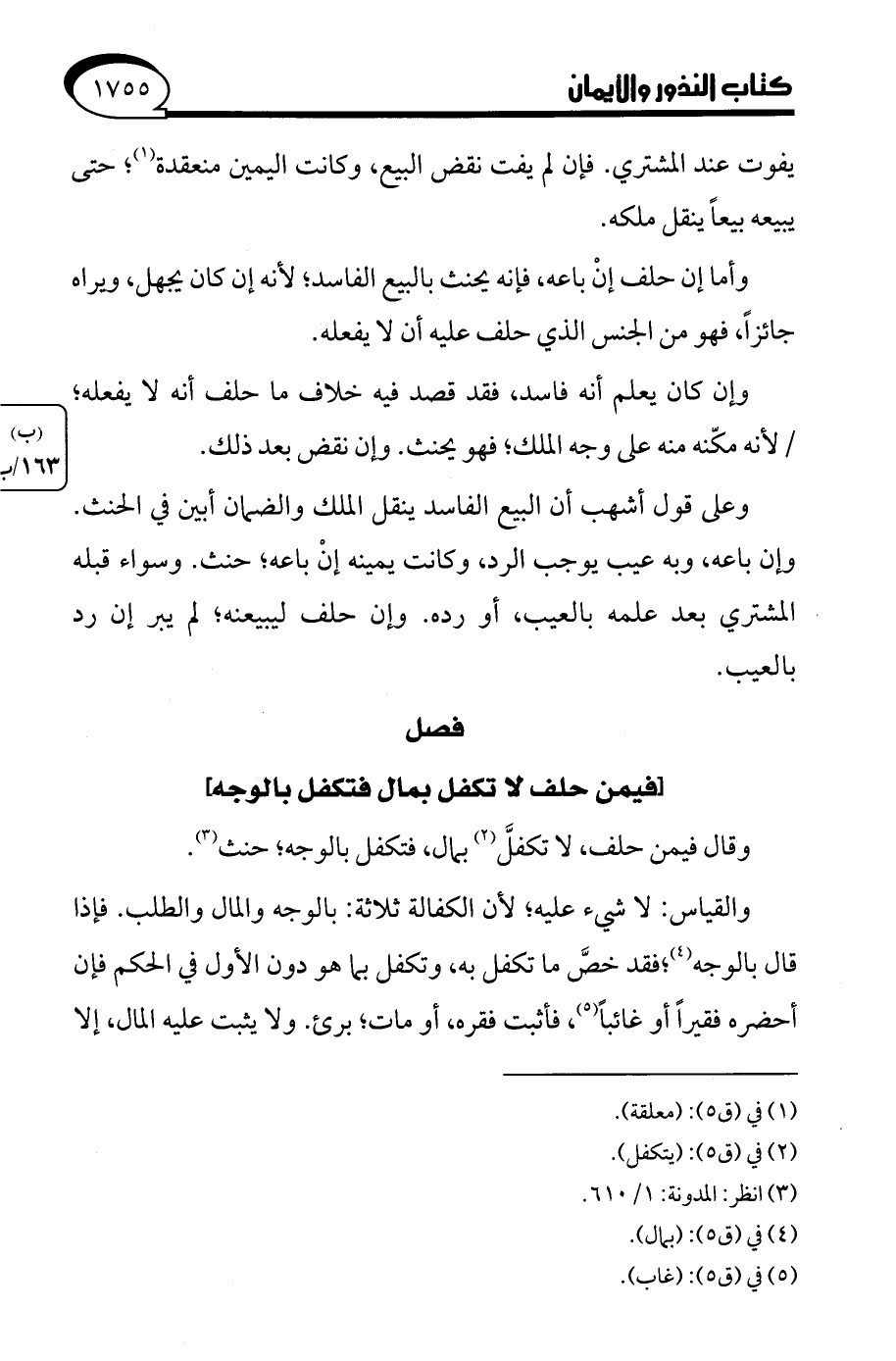 وقال فيمن حلف، لا تكفلَّ (¬2) بمال، فتكفل بالوجه، حنث (¬3).