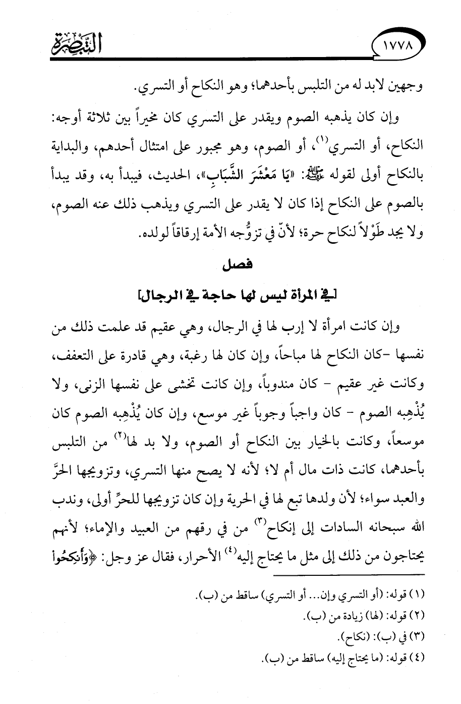 وإن كانت امرأة لا إرب لها في الرجال، وهي عقيم قد علمت ذلك من نفسها - كان النكاح لها مباحًا، وإن كان لها رغبة، وهي قادرة على التعفف، وكانت غير عقيم - كان مندوبًا، وإن كانت تخشى على نفسها الزنى، ولا يُذْهِبه الصوم - كان واجبًا وجوبًا غير موسع، وإن كان يُذْهِبه الصوم كان موسعًا، وكانت بالخيار بين النكاح أو الصوم، ولا بد لها (¬2) من التلبس بأحدهما، كانت ذات مال أم لا؛ لأنه لا يصح منها التسري، وتزويجها الحرَّ والعبد سواء؛ لأن ولدها تبع لها في الحرية وإن كان تزويجها للحرِّ أولى، وندب الله سبحانه السادات إلى إنكاح (¬3) من في رقهم من العبيد والإماء؛ لأنهم يحتاجون من ذلك إلى مثل ما يحتاج إليه (¬4) الأحرار، فقال -عز وجل-: {وَأَنْكِحُوا