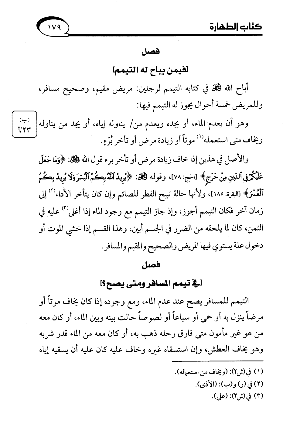 التيمم للمسافر يصح عند عدم الماء، ومع وجوده إذا كان يخاف موتًا أو مرضًا ينزل به أو حمى أو سباعًا أو لصوصًا حالت بينه وبين الماء، أو كان معه من هو غير مأمون متى فارق رحله ذهب به، أو كان معه من الماء قدر شربه وهو يخاف العطش، وإن استسقاه غيره وخاف عليه كان عليه أن يسقيه إياه