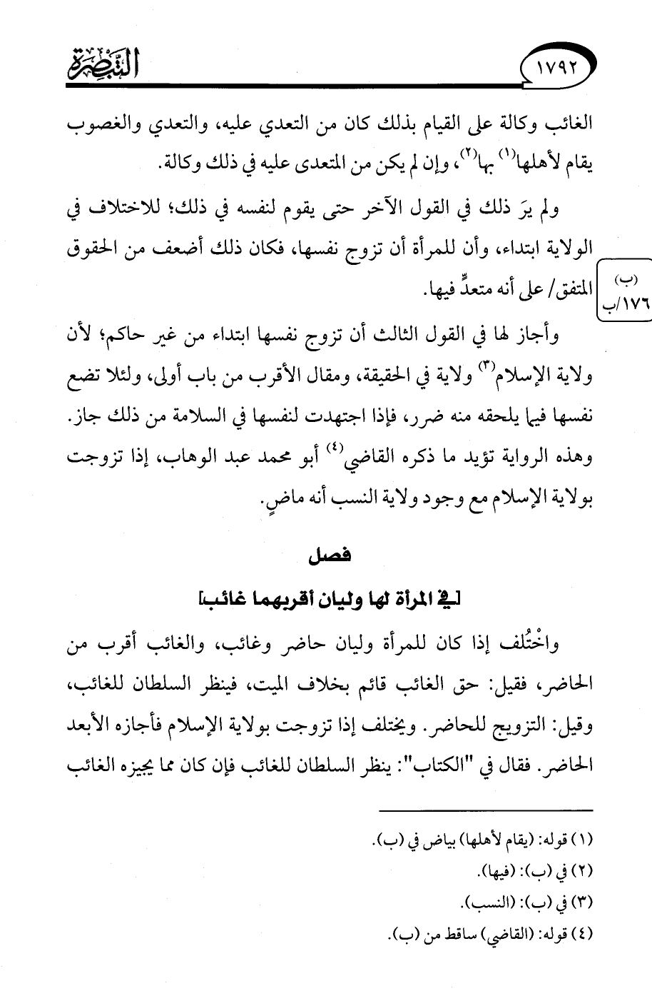 واخْتُلف إذا كان للمرأة وليان حاضر وغائب، والغائب أقرب من الحاضر، فقيل: حق الغائب قائم بخلاف الميت، فينظر السلطان للغائب، وقيل: التزويج للحاضر. ويختلف إذا تزوجت بولاية الإسلام فأجازه الأبعد الحاضر. فقال في "الكتاب": ينظر السلطان للغائب فإن كان مما يجيزه الغائب