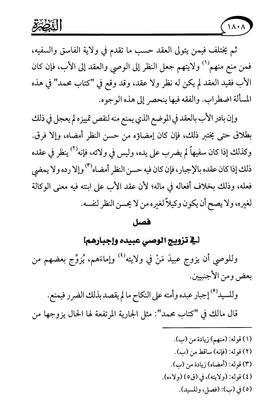 وإن بادر الأب بالعقد في الموضع الذي يمنع منه لنقص تمييزه لم يعجل في ذلك بطلاق حتى يختبر ذلك، فإن كان إمضاؤه من حسن النظر أمضاه، وإلا فرق. وكذلك إذا كان سفيهًا لم يضرب على يده، وليس في ولائه، فإنه (¬2) ينظر في عقده ذلك إذا كان عقده بالإجبار، فإن كان فيه حسن النظر أمضاه (¬3) وإلا رده ولا يمضي فعله، وذلك بخلاف أفعاله في ماله؛ لأن عقد الأب على ابنته فيه معنى الوكالة لغيره، ولا يصح أن يكون وكيلًا لغيره من لا يحسن النظر لنفسه.