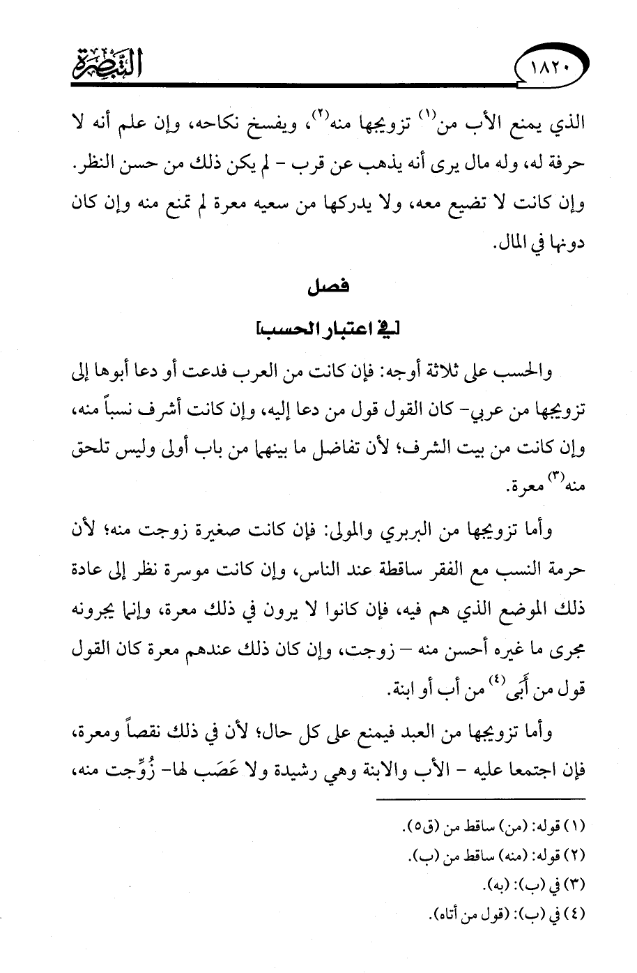 والحسب على ثلاثة أوجه: فإن كانت من العرب فدعت أو دعا أبوها إلى تزويجها من عربي- كان القول قول من دعا إليه، وإن كانت أشرف نسبًا منه، وإن كانت من بيت الشرف؛ لأن تفاضل ما بينهما من باب أولى وليس تلحق منه (¬3) معرة.