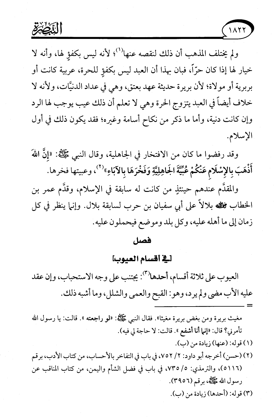 ولم يختلف المذهب أن ذلك لنقصه عنها (¬1)؛ لأنه ليس بكفؤٍ لها، وأنه لا خيار لها إذا كان حرًّا، فبان بهذا أن العبد ليس بكفؤٍ للحرة، عربية كانت أو بربرية أو مولاة؛ لأن بريرة حديثة عهد بعتق، وهي في عداد الدنيَّات، ولأنه لا خلاف أيضًا في العبد يتزوج الحرة وهي لا تعلم أن ذلك عيب يوجب لها الرد وإن كانت دنية، وأما ما ذكر من نكاح أسامة وغيره؛ فقد يكون ذلك في أول الإسلام.