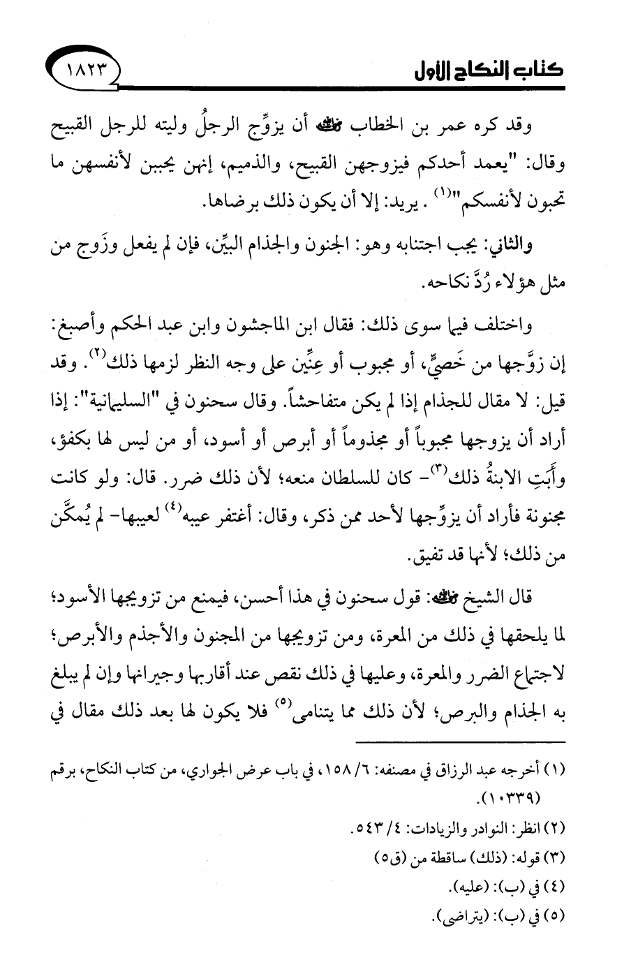 قال الشيخ - رضي الله عنه -: قول سحنون في هذا أحسن، فيمنع من تزويجها الأسود؛ لما يلحقها في ذلك من المعرة، ومن تزويجها من المجنون والأجذم والأبرص؛ لاجتماع الضرر والمعرة، وعليها في ذلك نقص عند أقاربها وجيرانها وإن لم يبلغ به الجذام والبرص؛ لأن ذلك مما يتنامى (¬5) فلا يكون لها بعد ذلك مقال في