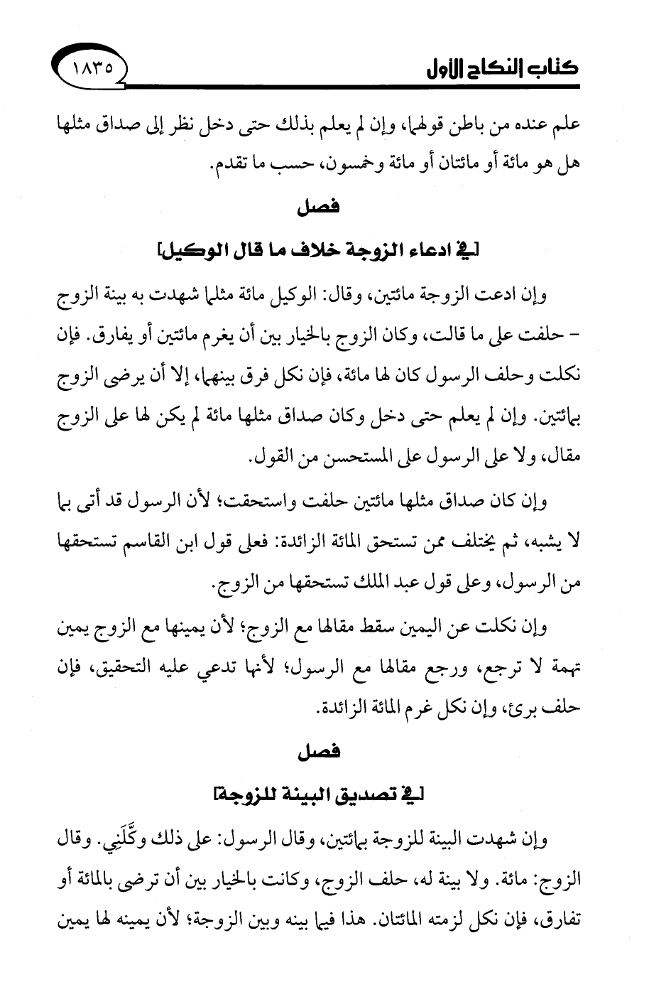 وإن نكلت عن اليمين سقط مقالها مع الزوج؛ لأن يمينها مع الزوج يمين تهمة لا ترجع، ورجع مقالها مع الرسول؛ لأنها تدعي عليه التحقيق، فإن حلف برئ، وإن نكل غرم المائة الزائدة.