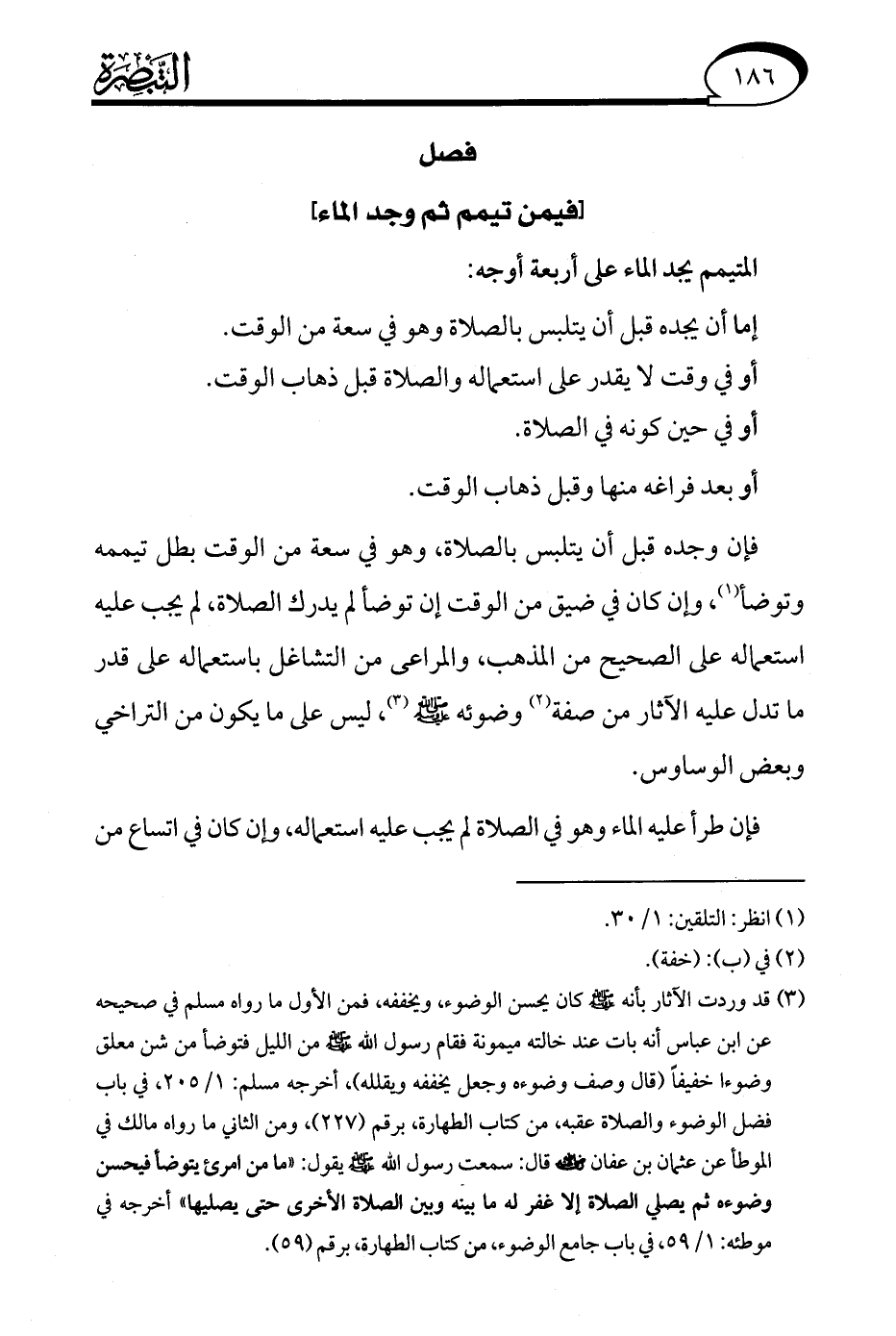 فإن وجده قبل أن يتلبس بالصلاة، وهو في سعة من الوقت بطل تيممه وتوضأ (¬1)، وإن كان في ضيق من الوقت إن توضأ لم يدرك الصلاة، لم يجب عليه استعماله على الصحيح من المذهب، والمراعى من التشاغل باستعماله على قدر ما تدل عليه الآثار من صفة (¬2) وضوئه - صلى الله عليه وسلم - (¬3)، ليس على ما يكون من التراخي وبعض الوساوس.