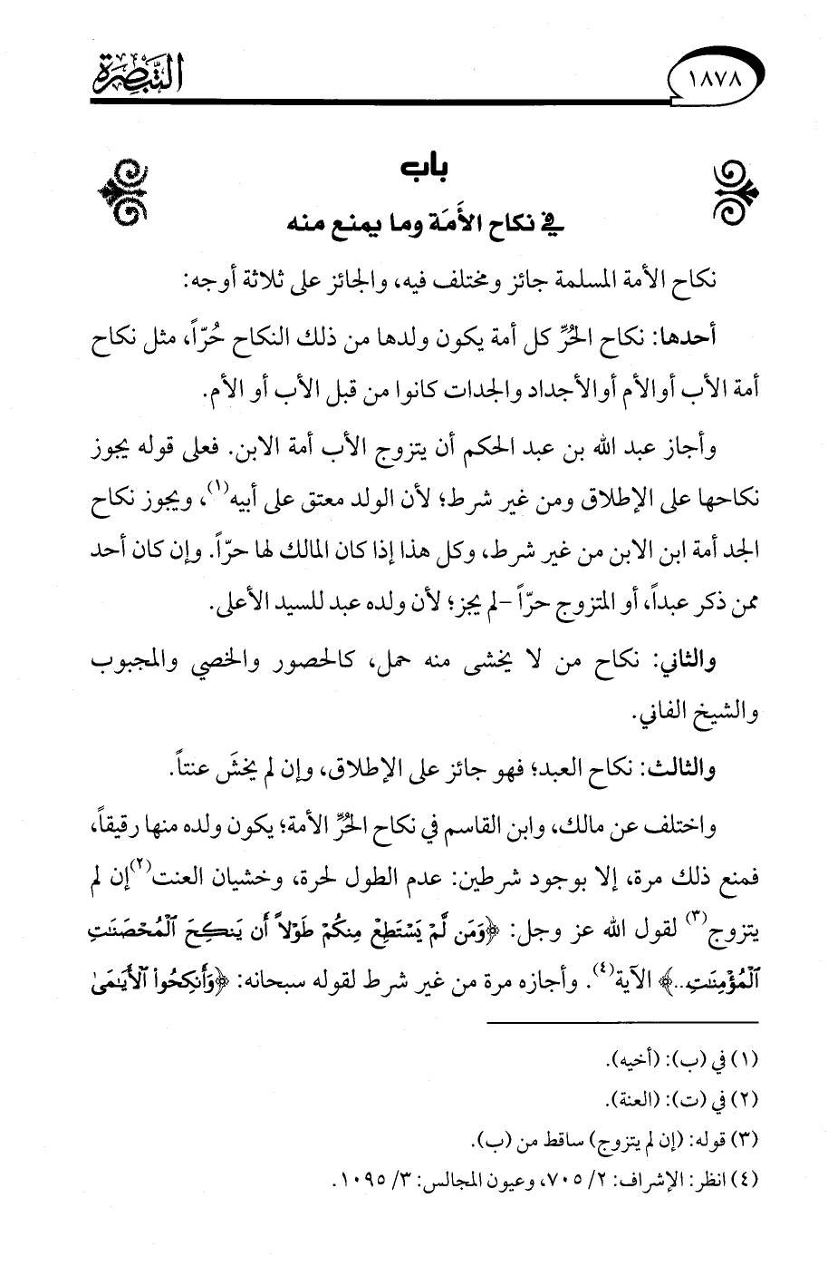 واختلف عن مالك، وابن القاسم في نكاح الحُرِّ الأمة؛ يكون ولده منها رقيقًا، فمنع ذلك مرة، إلا بوجود شرطين: عدم الطول لحرة، وخشيان العنت (¬2) إن لم يتزوج (¬3) لقول الله -عز وجل-: {وَمَنْ لَمْ يَسْتَطِعْ مِنْكُمْ طَوْلًا أَنْ يَنْكِحَ الْمُحْصَنَاتِ الْمُؤْمِنَاتِ. .} الآية (¬4). وأجازه مرة من غير شرط لقوله سبحانه: {وَأَنْكِحُوا الْأَيَامَى