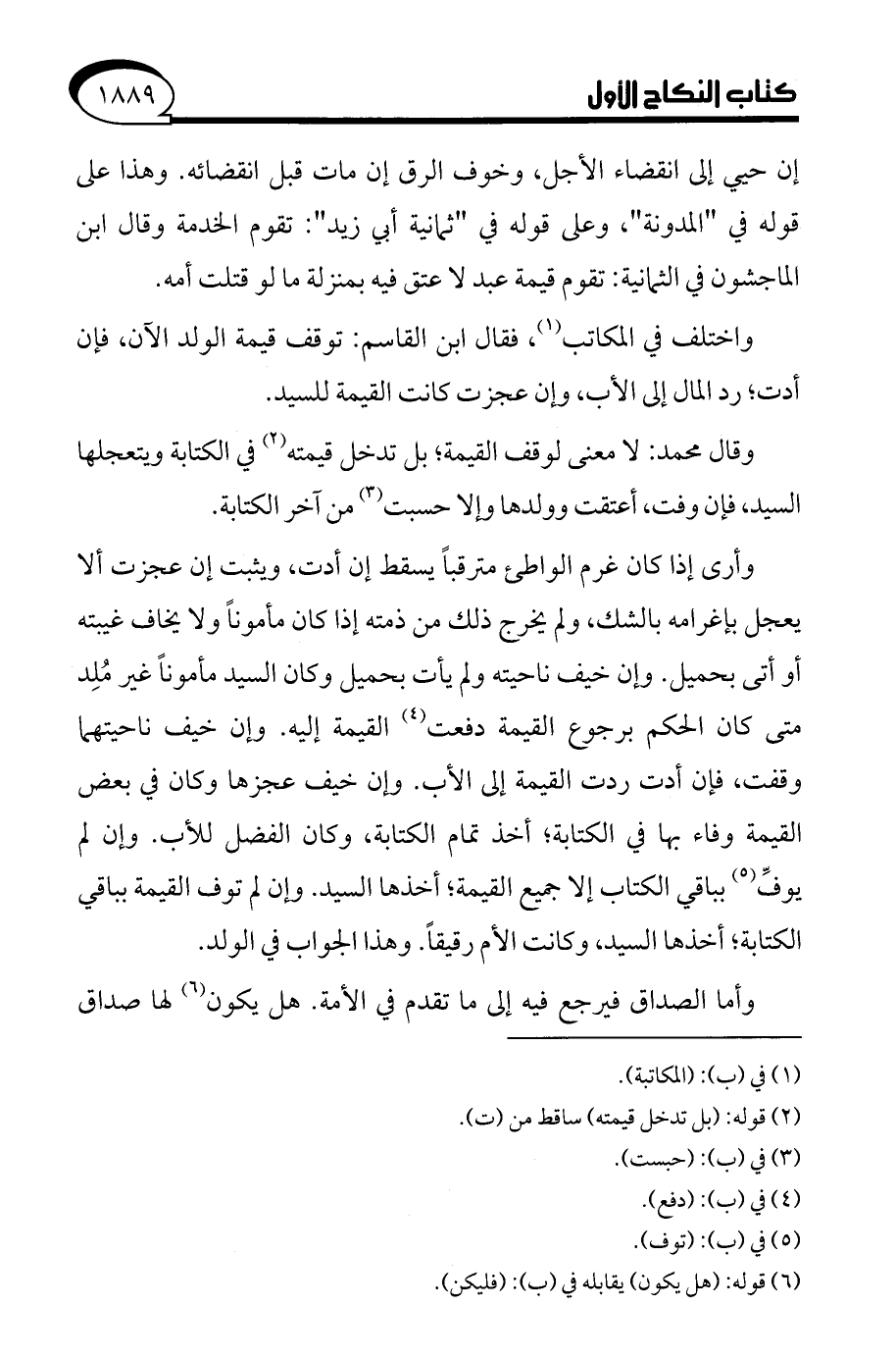 وأرى إذا كان غرم الواطئ مترقبًا يسقط إن أدت، ويثبت إن عجزت ألا يعجل بإغرامه بالشك، ولم يخرج ذلك من ذمته إذا كان مأمونًا ولا يخاف غيبته أو أتى بحميل. وإن خيف ناحيته ولم يأت بحميل وكان السيد مأمونًا غير مُلِد متى كان الحكم برجوع القيمة دفعت (¬4) القيمة إليه. وإن خيف ناحيتهما وقفت، فإن أدت ردت القيمة إلى الأب. وإن خيف عجزها وكان في بعض القيمة وفاء بها في الكتابة؛ أخذ تمام الكتابة، وكان الفضل للأب. وإن لم يوفِّ (¬5) بباقي الكتاب إلا جميع القيمة؛ أخذها السيد. وإن لم توف القيمة بباقي الكتابة؛ أخذها السيد، وكانت الأم رقيقًا. وهذا الجواب في الولد.