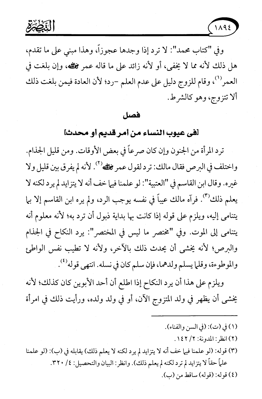 واختلف في البرص فقال مالك: ترد لقول عمر - رضي الله عنه - (¬2). لأنه لم يفرق بين قليل ولا غيره. وقال ابن القاسم في "العتبية": لو علمنا فيما خف أنه لا يتزايد لم يرد لكنه لا يعلم ذلك (¬3). فرآه مالك عيبًا في نفسه يوجب الرد، ولم يره ابن القاسم إلا بما يتنامى إليه، ويلزم على قوله إذا كانت بها بداية ذبول أن ترد به؛ لأنه معلوم أنه يتنامى إلى الموت. وفي "مختصر ما ليس في المختصر": يرد النكاح في الجذام والبرص؛ لأنه يخشى أن يحدث ذلك بالآخر، ولأنه لا تطيب نفس الواطئ والموطوءة، وقلما يسلم ولدهما، فإن سلم كان في نسله. انتهى قوله (¬4).