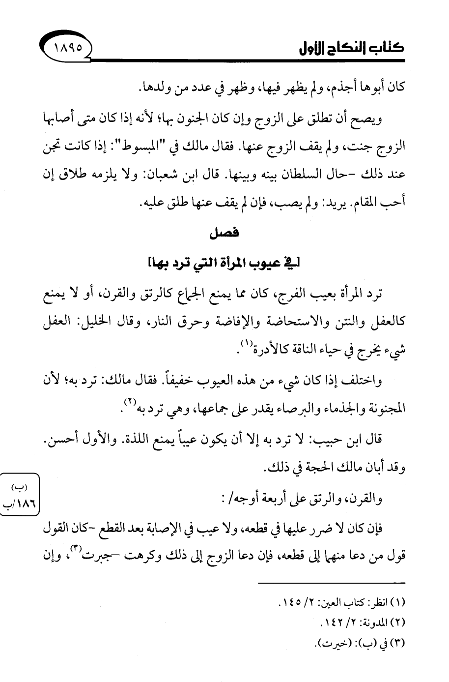 ترد المرأة بعيب الفرج، كان مما يمنع الجماع كالرتق والقرن، أو لا يمنع كالعفل والنتن والاستحاضة والإفاضة وحرق النار، وقال الخليل: العفل شيء يخرج في حياء الناقة كالأدرة (¬1).