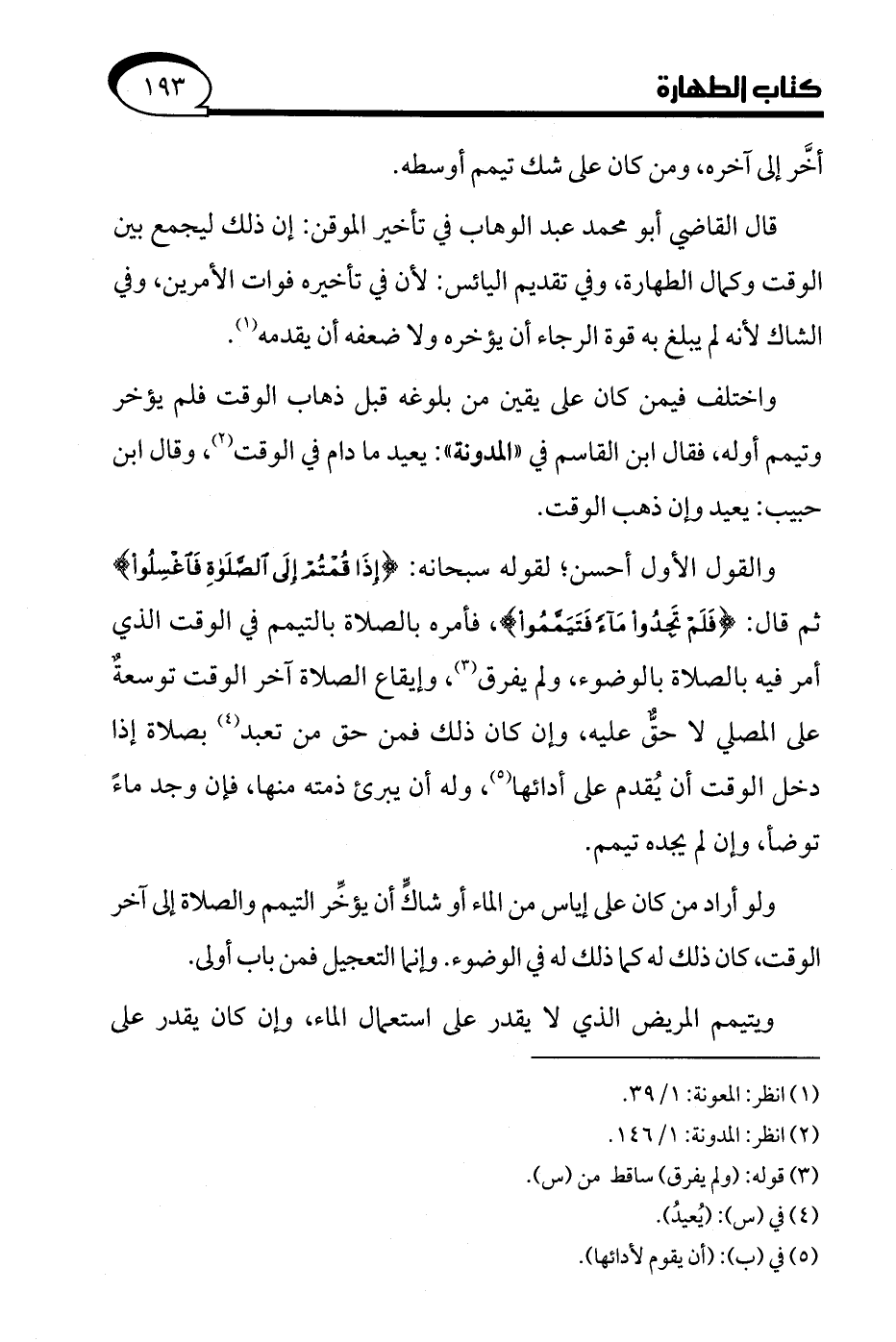 قال القاضي أبو محمد عبد الوهاب في تأخير الموقن: إن ذلك ليجمع بين الوقت وكمال الطهارة، وفي تقديم اليائس: لأن في تأخيره فوات الأمرين، وفي الشاك لأنه لم يبلغ به قوة الرجاء أن يؤخره ولا ضعفه أن يقدمه (¬1).