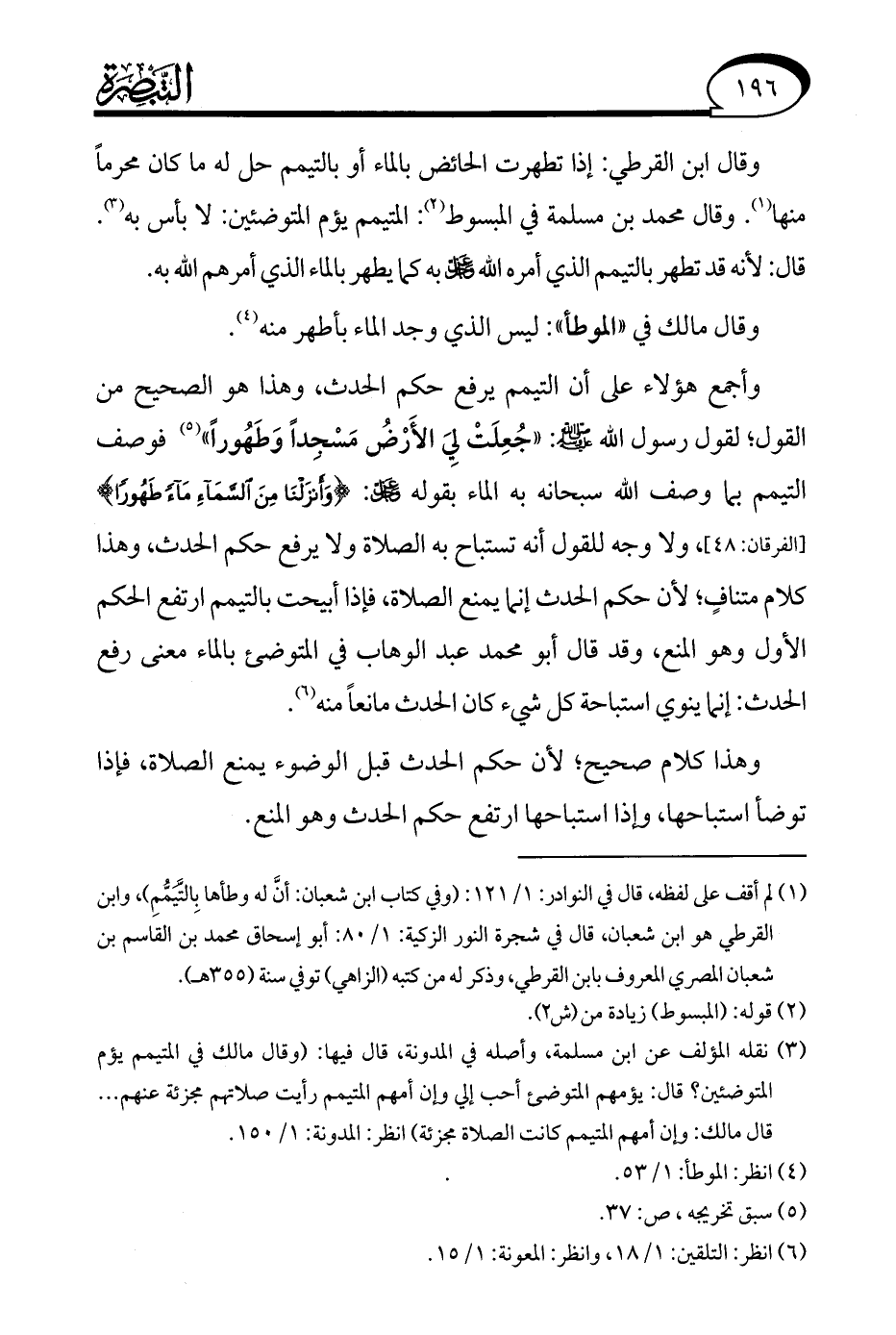 (¬1) لم أقف على لفظه، قال في النوادر: 1/ 121: (وفي كتاب ابن شعبان: أنَّ له وطأها بِالتَّيَمُّمِ)، وابن القرطي هو ابن شعبان، قال في شجرة النور الزكية: 1/ 80: أبو إسحاق محمد بن القاسم بن شعبان المصري المعروف بابن القرطي، وذكر له من كتبه (الزاهي) توفي سنة (355 هـ).